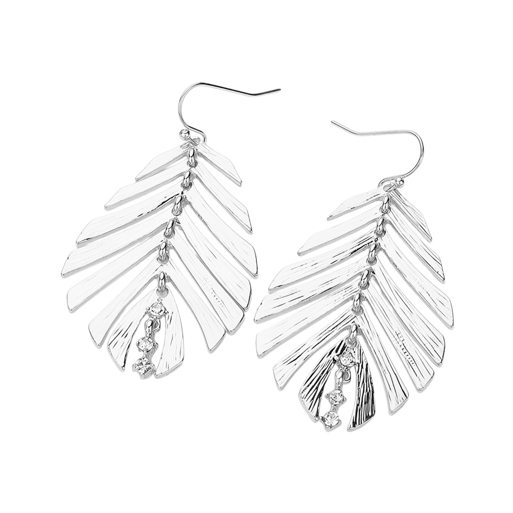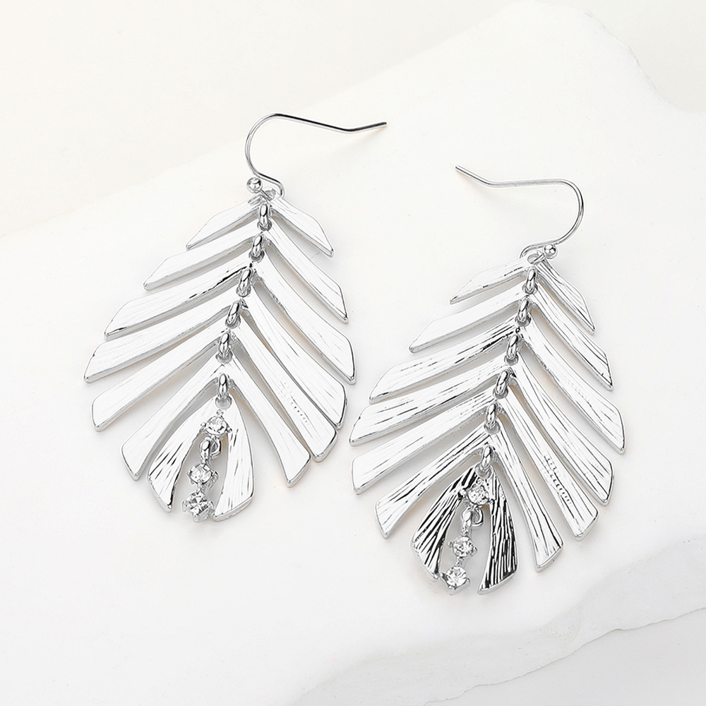 Stone Paved Textured Metal Tropical Leaf Dangle Earrings