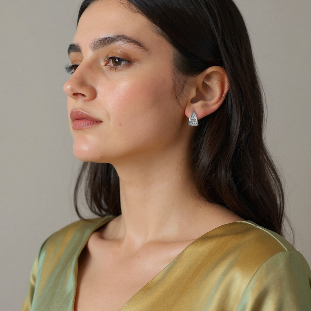 • Elevate your look with these geometric triangle hoop earrings adorned with dazzling cubic zirconia. Their bold, modern design and sparkling detail make them a standout accessory, perfect for adding a touch of sophistication to casual or evening outfits.