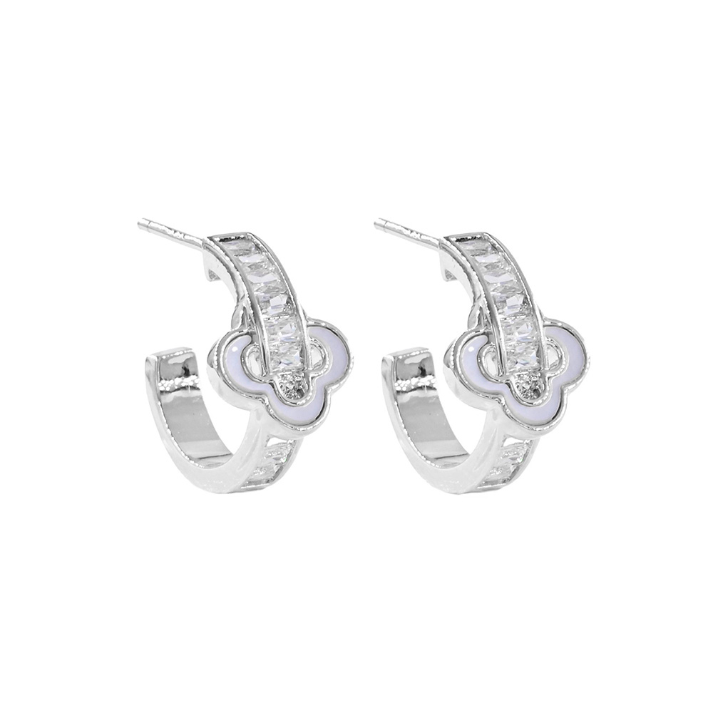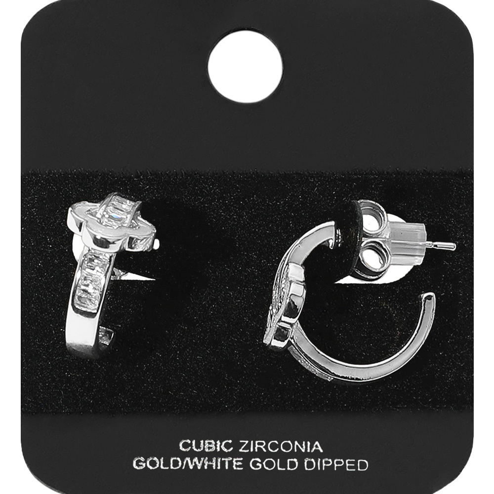 Details • Size : 0.8" X 0.75" X 0.4" • Post Back • Stylish hoop earrings featuring a quatrefoil-inspired accent and sparkling cubic zirconia. Designed with a sleek finish, these earrings add sophistication to both casual and formal outfits. Lightweight and versatile, perfect for elevating your everyday style or gifting. • CZ Cubic Zirconia • Gold Dipped • Lead and Nickel Compliant