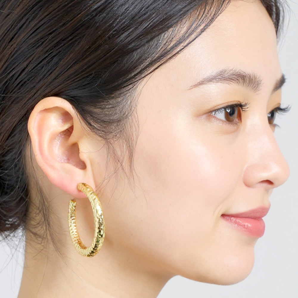 • Elevate your look with these hammered hoop earrings, featuring a textured surface that reflects light with every movement. Their bold yet versatile design adds a touch of artistry and sophistication, making them perfect for casual outfits or refined evening wear.