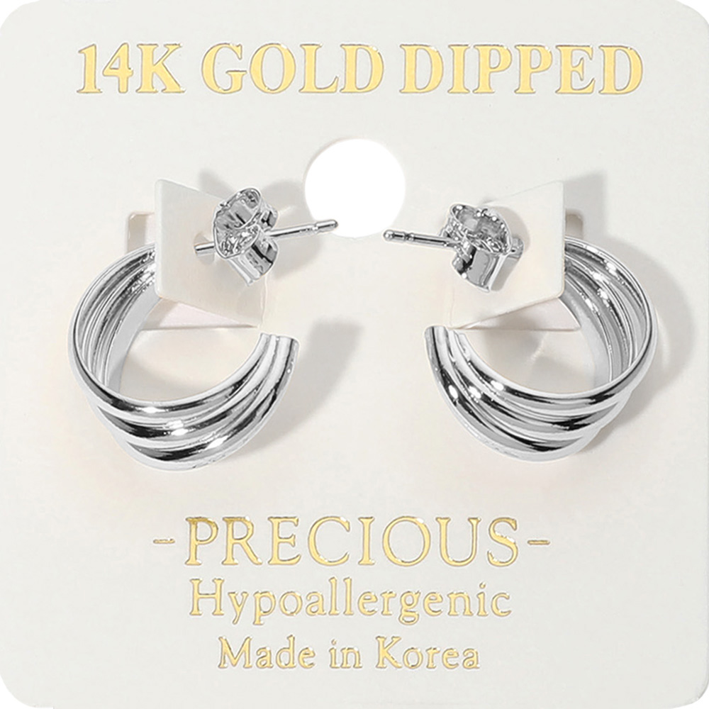 Details • Size : 0.7" X 0.6" • Post Back • Contemporary layered hoop earrings with a bold yet elegant design. Hypoallergenic and lightweight for everyday comfort. Perfect for adding a stylish statement to casual or formal outfits, making them a versatile addition to any jewelry collection. • Hypoallergenic • Made In Korea • Gold Dipped