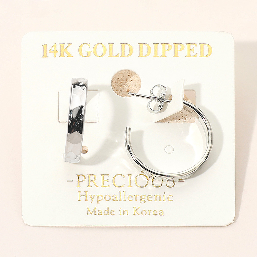 Details • Size : 0.75" X 0.75" X 0.2" • Post Back • Stylish hoop earrings with a hammered texture for a bold yet refined look. Their sculpted surface adds dimension and elegance, perfect for accentuating any outfit from daywear to special occasions. • Lead and Nickel Compliant • Hypoallergenic • Made In Korea • Gold Dipped