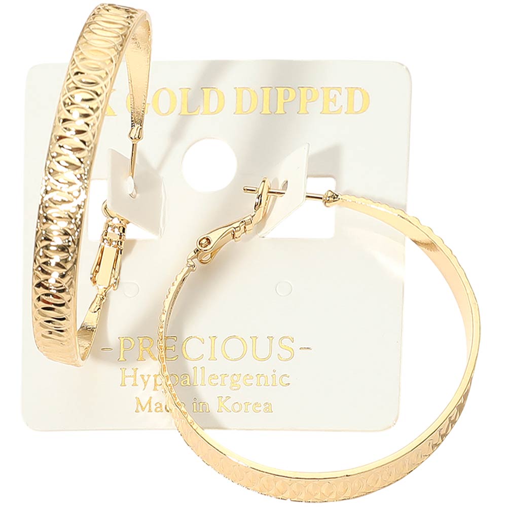Details • Size : 1.6" X 1.6" X 0.25" • Omega Back • Add modern flair to your accessories with these shimmering textured hoop earrings. The reflective finish and subtle wave pattern bring a sleek sophistication, perfect for elevating your everyday look or complementing a night-out ensemble with ease. • Hypoallergenic • Made In Korea • Gold Dipped