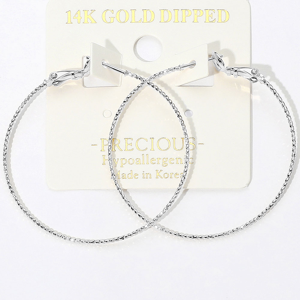 Details • Size : 1.8" X 1.8" • Omega Back • Lightweight hoop earrings featuring a thin, textured surface for a stylish statement. Designed for comfort and elegance, these hoops are perfect for daily wear or special events. An easy match for casual and dressy looks alike. • Hypoallergenic • Made In Korea • Gold Dipped