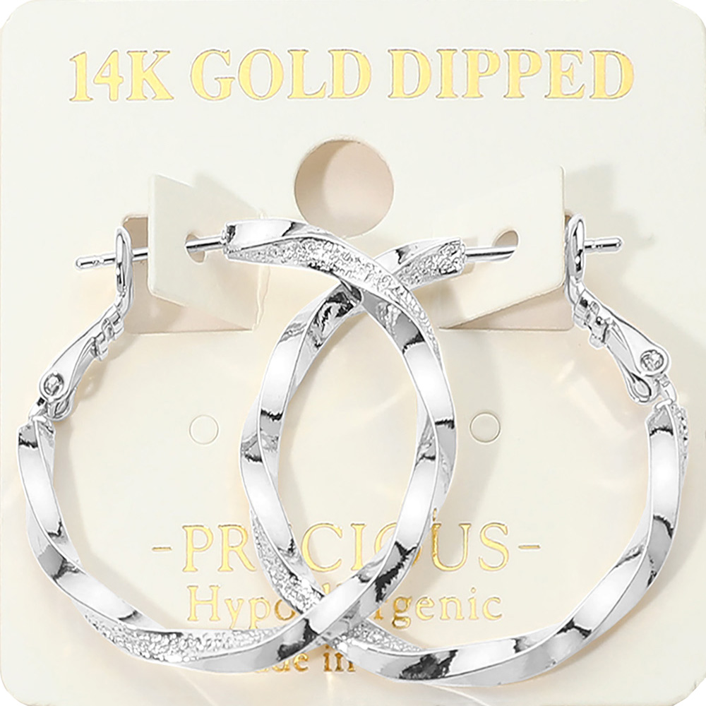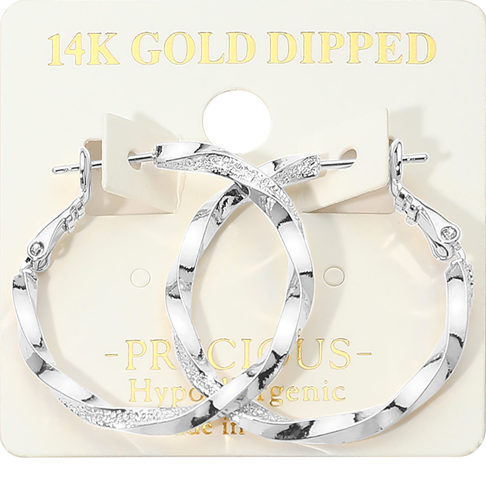 Details • Size : 1.25" X 1.25" • Omega Back • These textured twisted hoop earrings feature an elegant layered design that adds depth and shine to any look. Crafted with a secure latch closure for comfortable all-day wear, they blend modern style with timeless appeal, making them perfect for everyday outfits or special occasions. • Gold Dipped • Hypoallergenic • Made In Korea