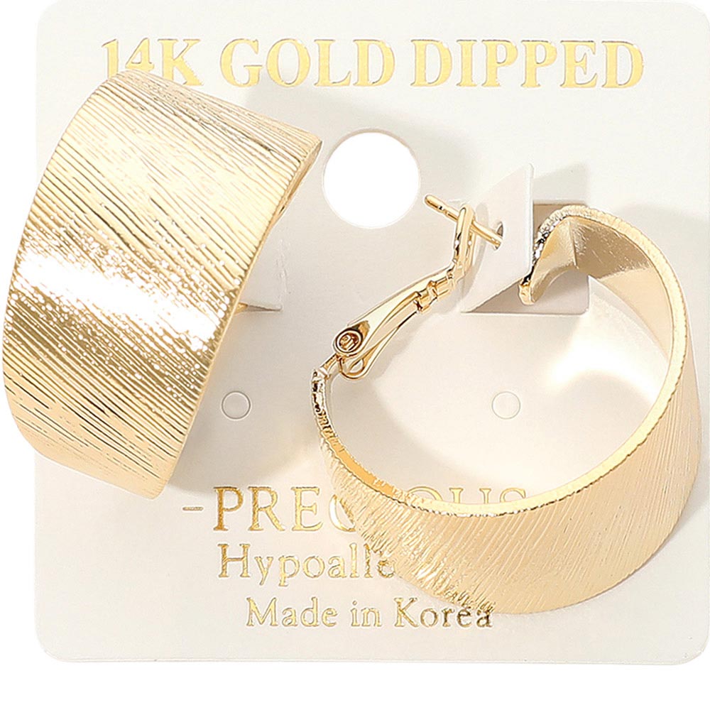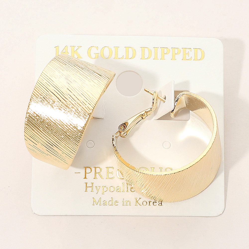 Details • Size : 1" X 1" X 0.6" • Omega Back • Elevate your everyday look with these textured wide hoop earrings featuring a sculpted, dimensional design for bold yet wearable style. Lightweight and comfortable for all-day wear, they transition effortlessly from casual outfits to evening ensembles, making them a versatile accessory or thoughtful gift for confident, modern flair. • Gold Dipped • Hypoallergenic • Made In Korea