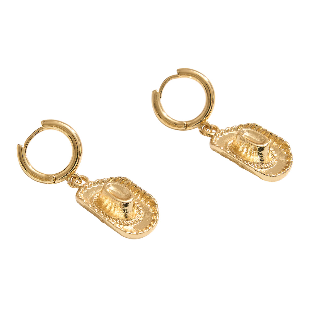 Details • Size : 0.5" X 1.3" • Huggie Back • These cowboy hat dangle hoop earrings bring playful western charm to your jewelry collection. Featuring detailed hat pendants that swing from sleek hoops, they’re perfect for adding a fun, standout accent to casual outfits, festivals, or themed events. • Brass • Gold Dipped • Hypoallergenic • Lead and Nickel Compliant • Made In Korea