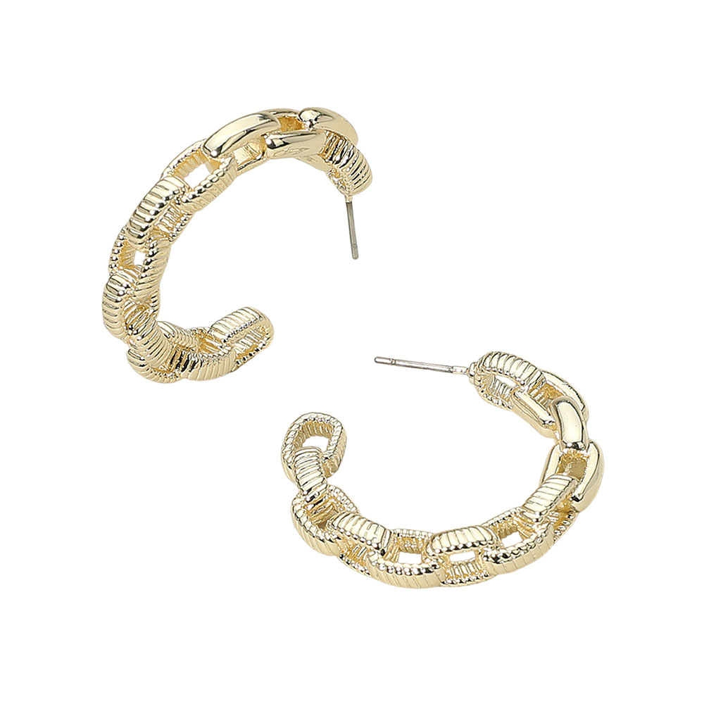 Details • Size : 1.25" X 1.25" X 0.25" • Post Back • Stylish chain link hoop earrings with a bold textured design that adds modern flair. Lightweight yet eye-catching, these hoops bring a contemporary edge, making them perfect for both casual and dressy occasions. • Gold Dipped