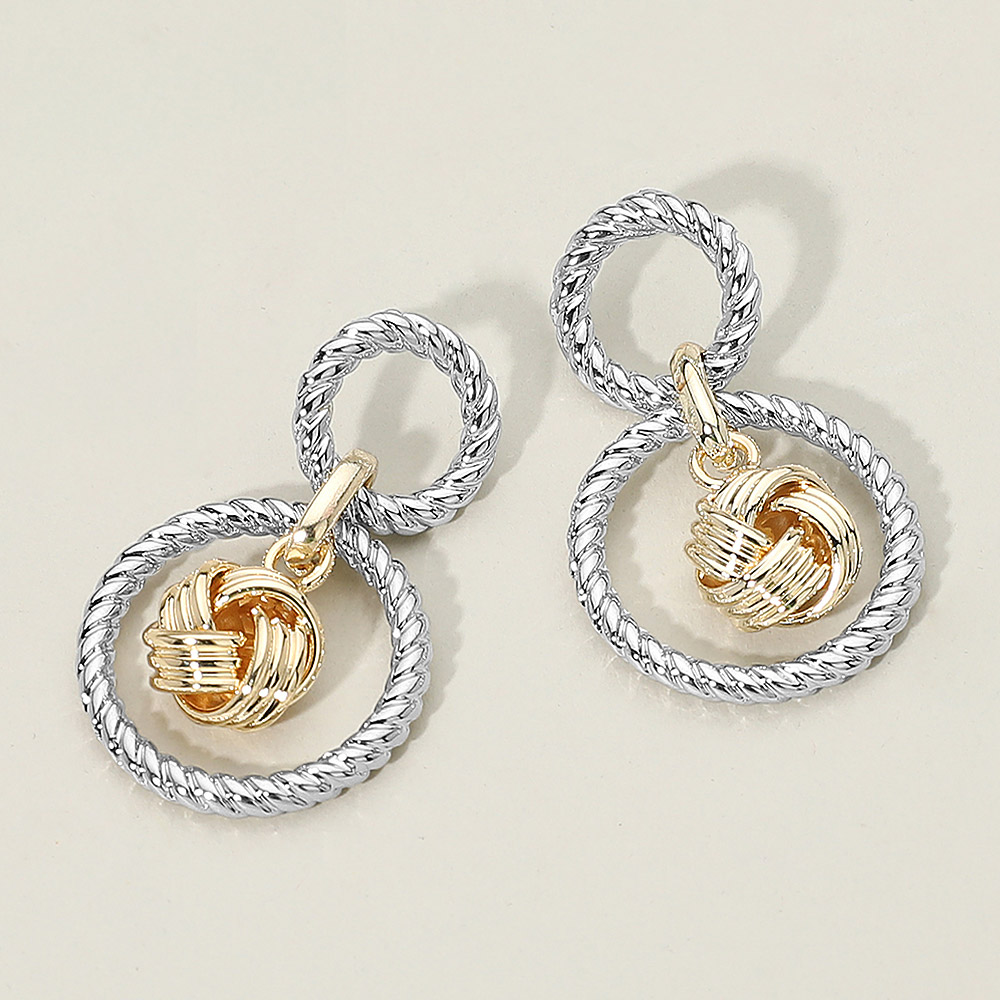Details • Size : 1" X 1.5" • Post Back • Chic double hoop knot drop earrings featuring a twisted hoop design with a detailed knot charm. Lightweight and stylish, perfect for everyday wear or adding a touch of elegance to special occasions. A versatile accessory that enhances any outfit with its refined and modern look. • Gold Dipped