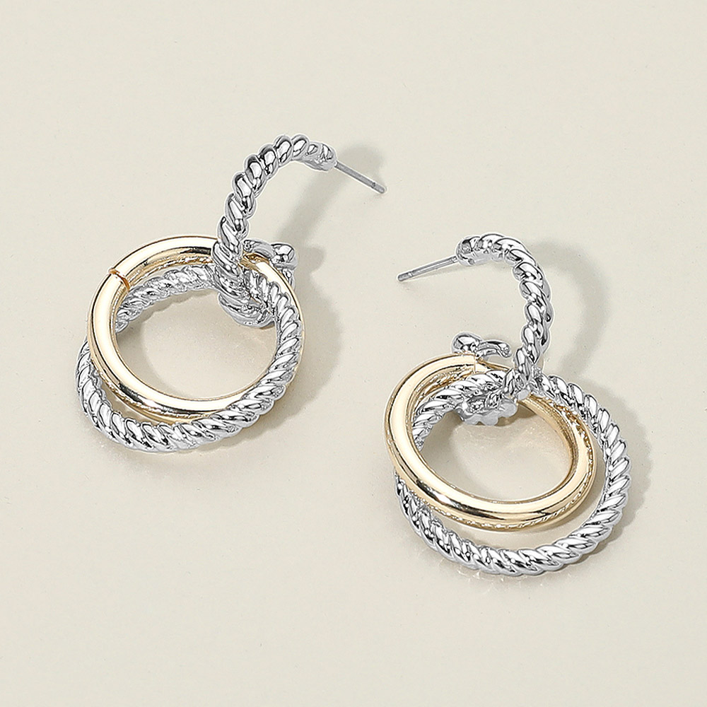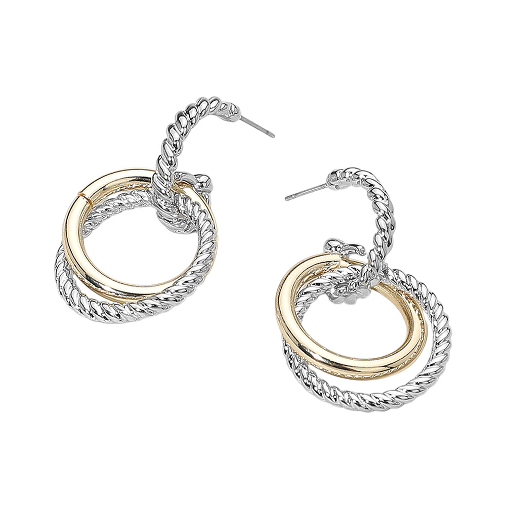 Details • Size : 1" X 1.5" • Post Back • These interlocking hoop earrings feature a mix of smooth and textured loops for a bold yet refined look. Their dimensional design adds movement and visual interest, making them a standout accessory that elevates both casual and dressy outfits with ease and modern style. • Gold Dipped