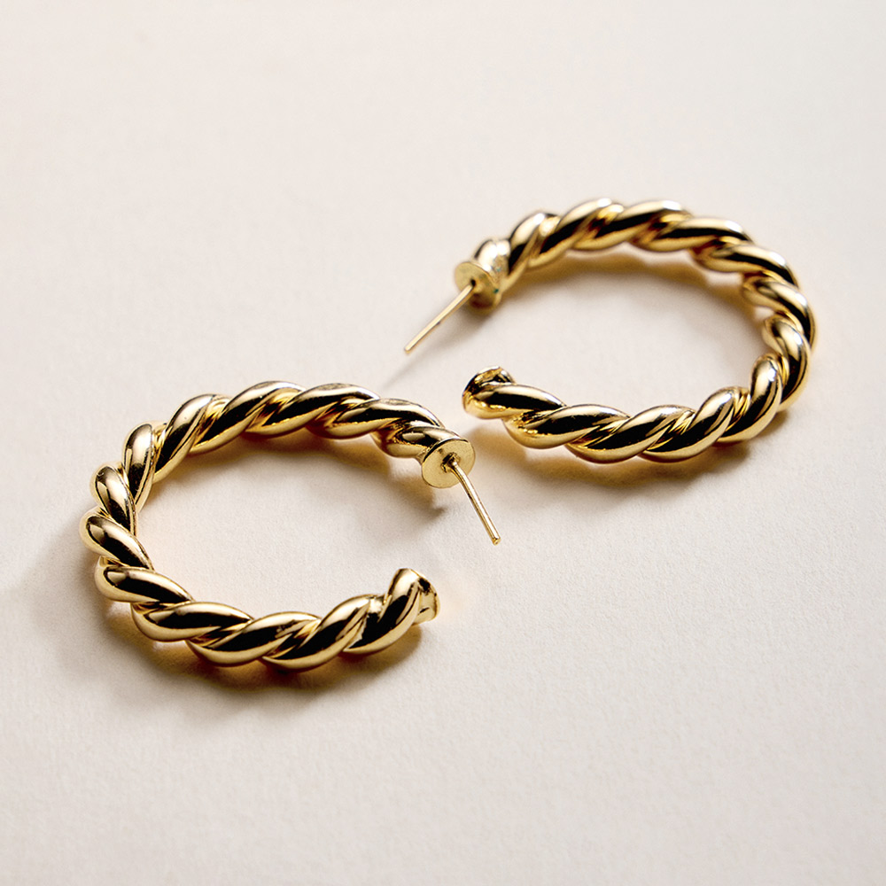 Details • Size : 1.5" X 1.5" X 0.25" • Post Back • Bold twisted hoop earrings featuring a rope-inspired design that adds texture and movement to any outfit. A timeless silhouette with a modern edge, perfect for everyday wear or elevated styling, ideal for gifting, layering, or making a confident statement with effortless versatility. • Lead and Nickel Compliant • Hypoallergenic • Gold Filled • Made In Brazil