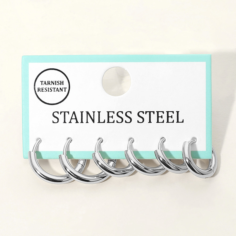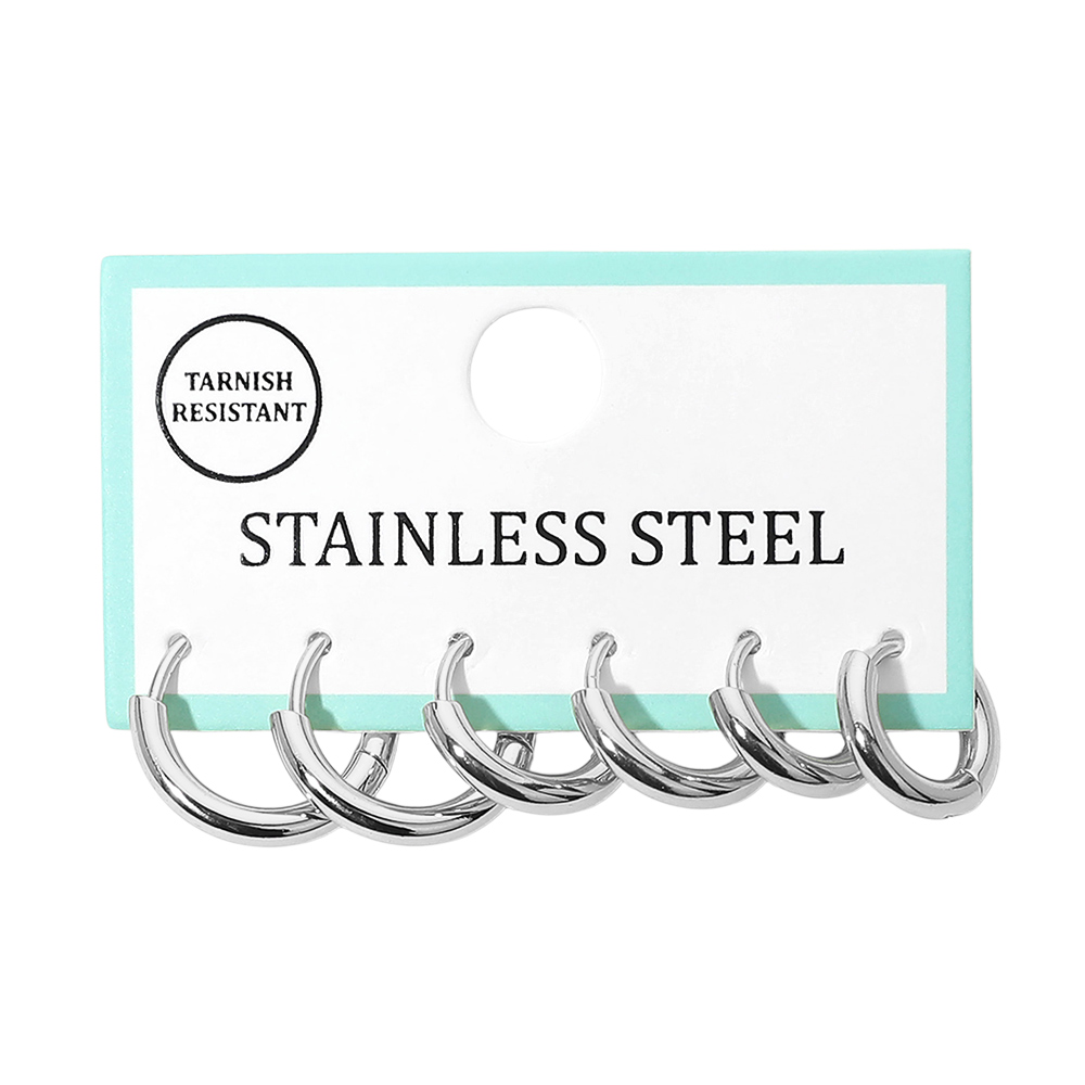 Details • Size : 0.5" - 0.75" L • Huggie Back • Essential hoop earring multi pair set designed for everyday versatility. Featuring smooth rounded silhouettes in graduated sizes, this set is ideal for mixing, matching, and stacking across multiple piercings, offering effortless styling from minimal looks to layered statements. • Lead and Nickel Compliant • Stainless Steel