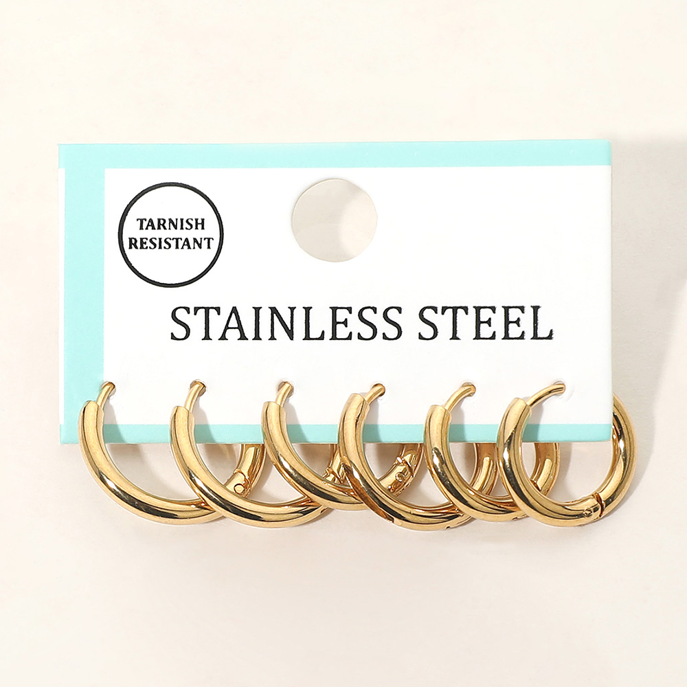 Details • Size : 0.6" - 0.7" L • Huggie Back • Timeless hoop earring multi pair set designed for everyday styling and layering. Featuring smooth rounded silhouettes in graduated sizes, this versatile set allows easy mixing and matching across multiple piercings, perfect for minimalist looks or stacked statement ear styling. • Lead and Nickel Compliant • Stainless Steel