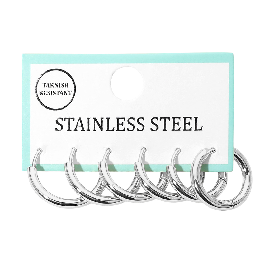 Details • Size : 0.6" - 0.75" L • Huggie Back • Versatile hoop earring multi pair set designed for everyday wear and easy layering. Featuring smooth rounded silhouettes in graduated sizes, this set allows effortless mixing and matching across multiple piercings for clean, modern, and timeless ear styling. • Lead and Nickel Compliant • Stainless Steel