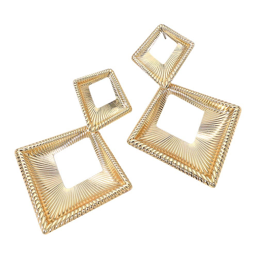 Details • Size : 2" X 3.25" • Post Back • Bold geometric drop earrings featuring a layered open square design with fine linear texture that adds depth and dimension. These statement earrings offer lightweight movement with a modern, sculptural look, making them perfect for everyday styling, work outfits, or elevated evening wear. Ideal for customers seeking contemporary square drop earrings with artistic detail. • Lead and Nickel Compliant