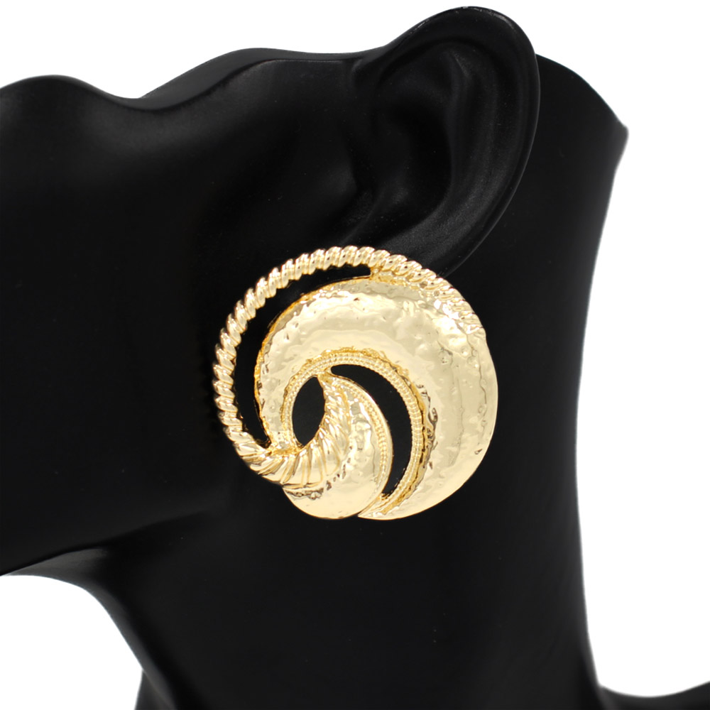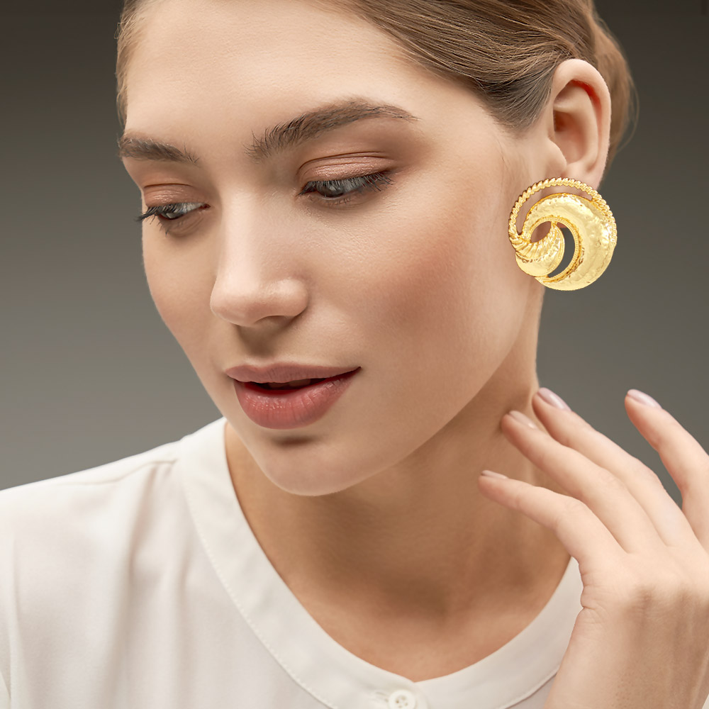 Details • Size : 0.8" X 2.7" • Post Back • Eye-catching swirl statement earrings featuring a bold sculptural shape and textured detailing that adds depth and dimension. Designed to stand out effortlessly, they elevate everyday looks and pair beautifully with both polished and contemporary styles for a striking finish. • Lead and Nickel Compliant
