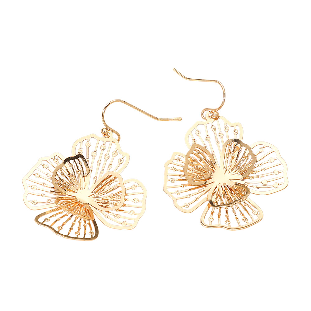 Details • Size : 1.4" X 1.8" • Fish Hook Back • Enhance your look with these delicate bloom petal drop earrings, featuring graceful floral cutout detailing and a lightweight design. Perfect for adding an elegant, feminine touch to any outfit, these earrings combine modern artistry with timeless sophistication for everyday charm. • Brass • Lead and Nickel Compliant