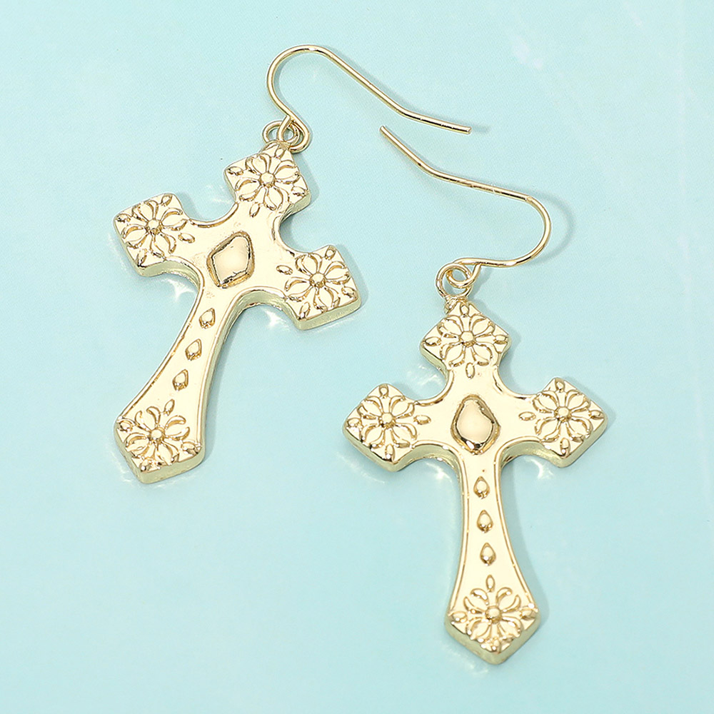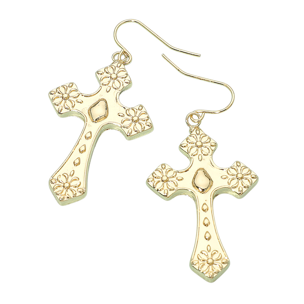 Details • Size : 1" X 2" • Fish Hook Back • Make a meaningful style statement with these embossed cross drop earrings featuring intricate detailing and a lightweight design for easy wear. Ideal for everyday looks or special occasions, they add graceful symbolism and refined charm to any jewelry collection. • Lead and Nickel Compliant