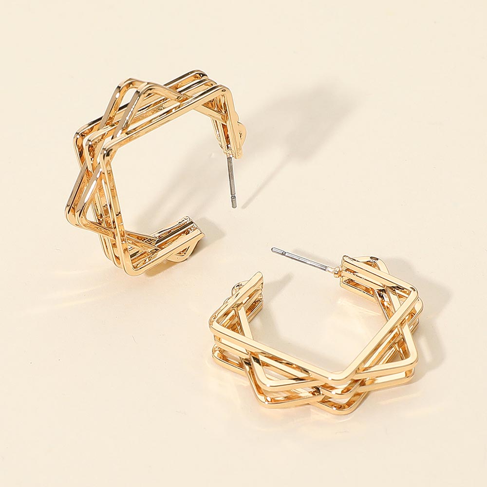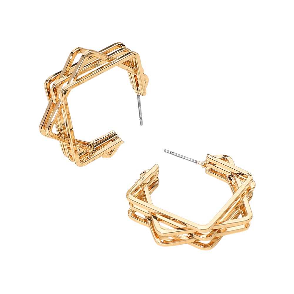 Details • Size : 1.25" X 1.25" X 0.25" • Post Back • Make a bold statement with these geometric layered hoop earrings, featuring a modern interlocking design for a contemporary edge. Lightweight and versatile, these hoops effortlessly elevate everyday looks or evening outfits, offering a perfect blend of chic and sophistication. • Lead and Nickel Compliant