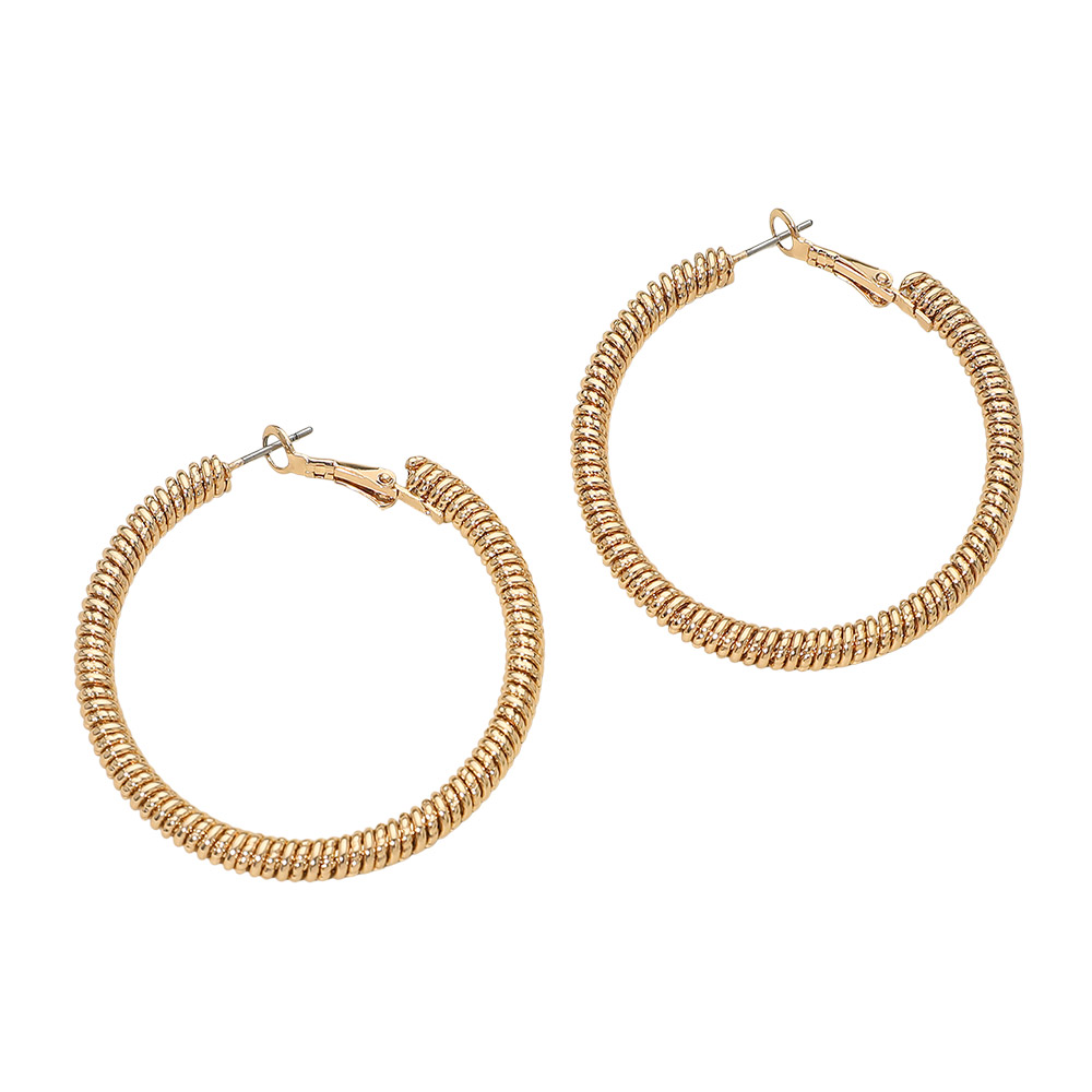 Details • Size : 2" X 2" • Omega Back • Trendy coil-texture hoop earrings featuring a spring-inspired wrapped design that adds bold dimension to any look. Lightweight, comfortable, and easy to style for everyday outfits or dressy occasions, with secure latch-back closure for reliable wear. • Lead and Nickel Compliant • Gold Dipped