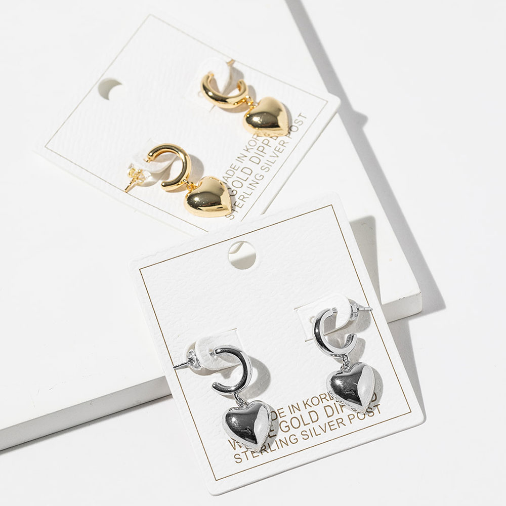 White Gold Dipped Puffy Heart Drop Dangle Mini Hoop Earrings