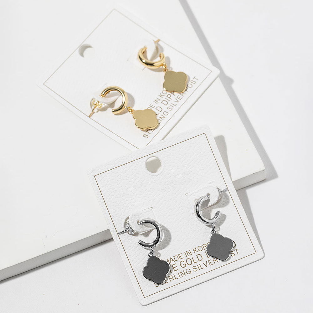 • Modern hoop drop earrings featuring a smooth quatrefoil charm silhouette that adds a refined, minimalist accent to any look. Designed for easy everyday wear, these earrings pair effortlessly with casual outfits or dressier styles, making them ideal for gifting and versatile retail collections.