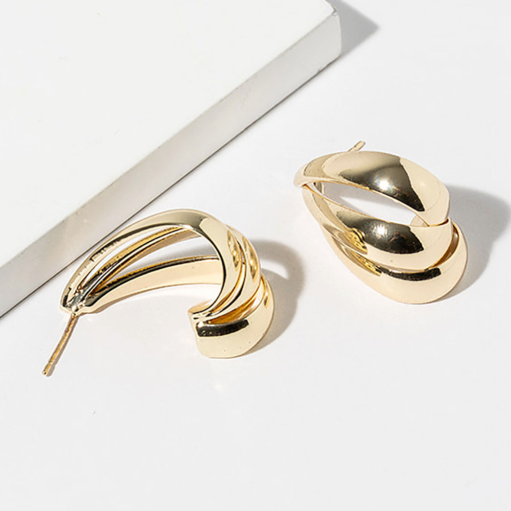 Details • Size : 0.75" X 1.1" • Modern stud earrings featuring a sculpted teardrop silhouette with layered curved detailing and a smooth polished finish. Designed to elevate everyday looks and refined outfits, these statement studs offer dimensional style, elegant contours, and versatile appeal, making them a standout addition to any contemporary jewelry collection. • Gold Dipped • Lead and Nickel Compliant • Made In Korea • Sterling Silver Post