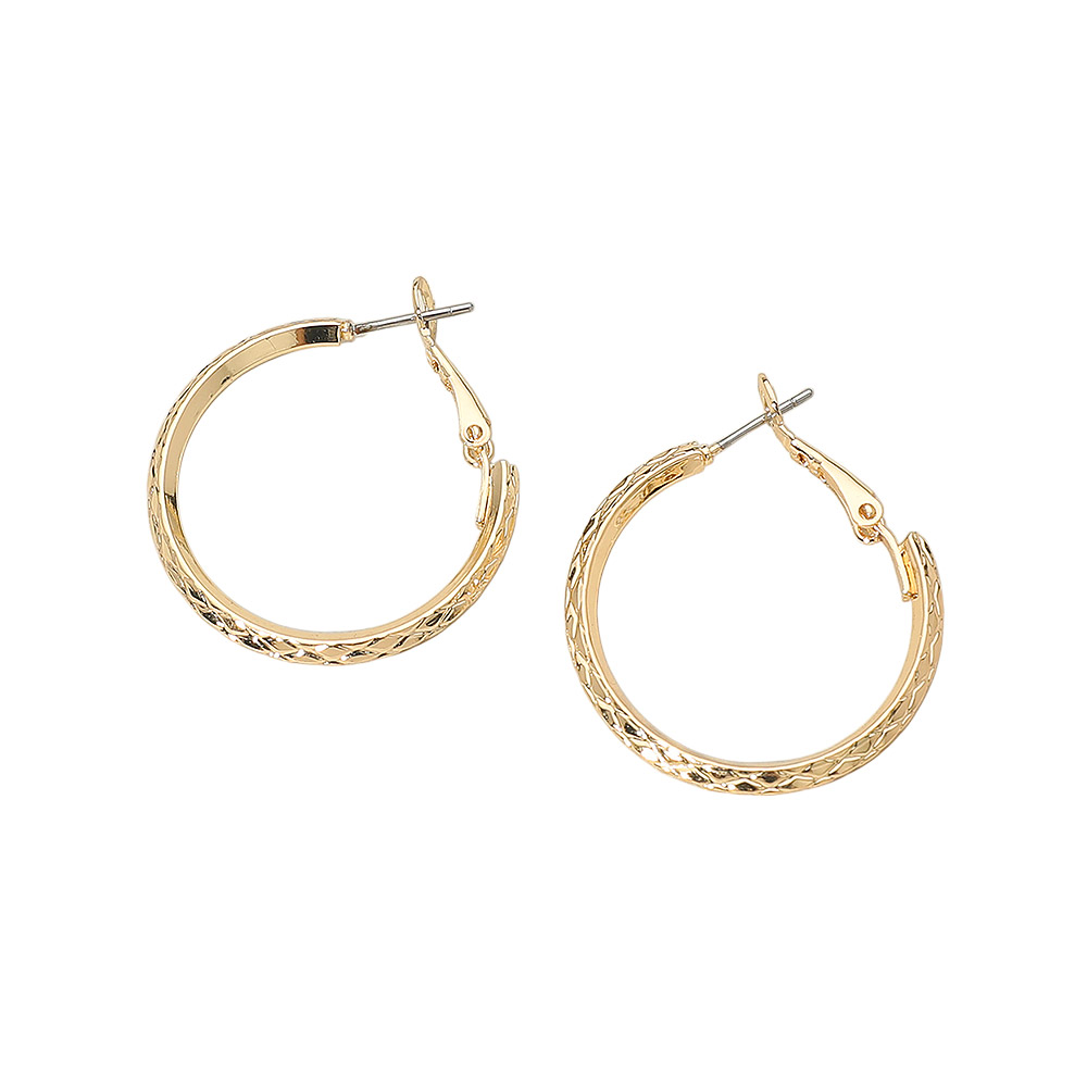 Details • Size : 1.2" X 1.2" • Omega Back • Chic small hoop earrings with a textured, diamond-cut look that adds stylish shine. Lightweight and comfortable with secure latch backs, perfect for daily wear or elevating casual and dressy outfits. • Lead and Nickel Compliant • Gold Dipped