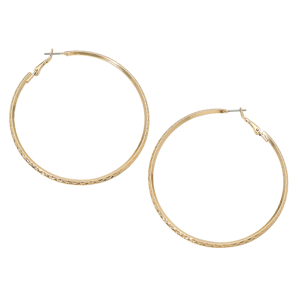 Details • Size : 2.75" X 2.75" • Omega Back • Large hoop earrings with a slim, textured round design that catches the light from every angle. Lightweight and comfortable for all-day wear, featuring secure latch backs for an effortless statement with casual or dressy outfits. • Lead and Nickel Compliant • Gold Dipped