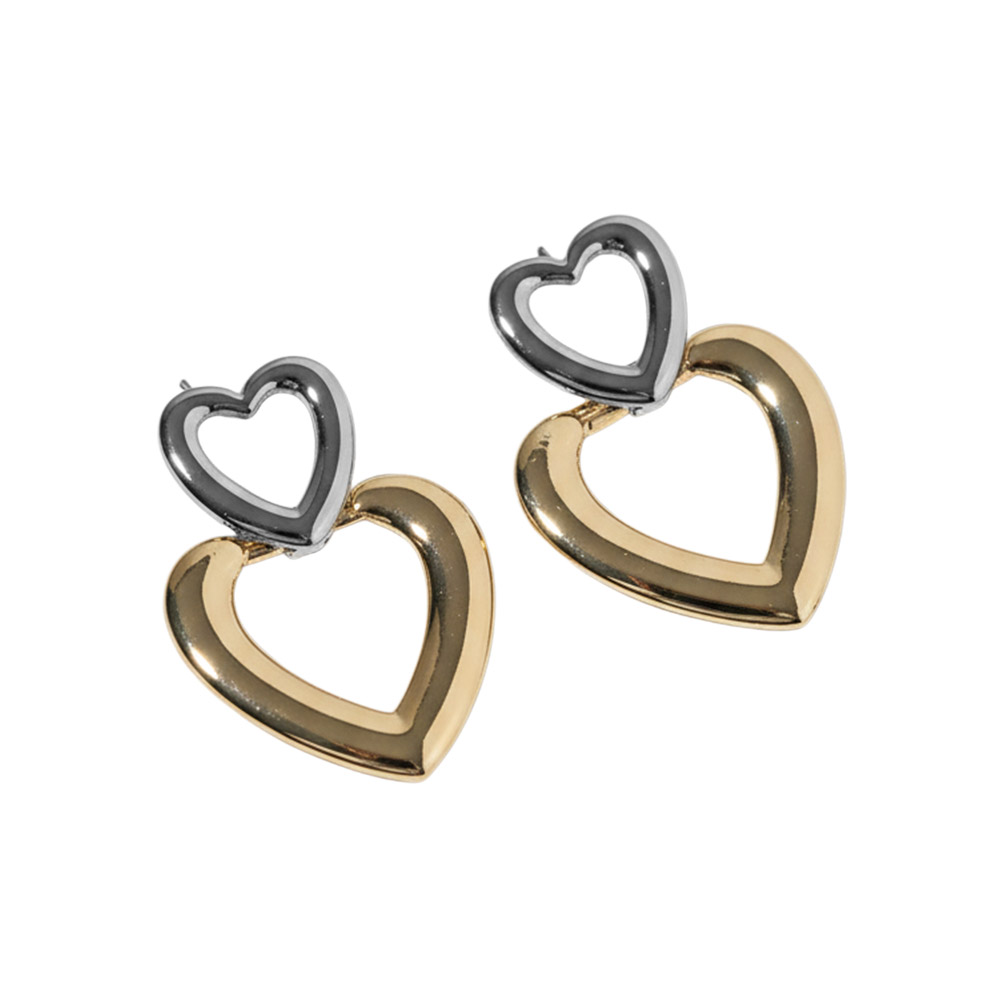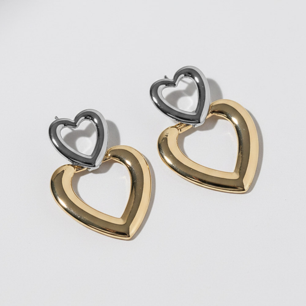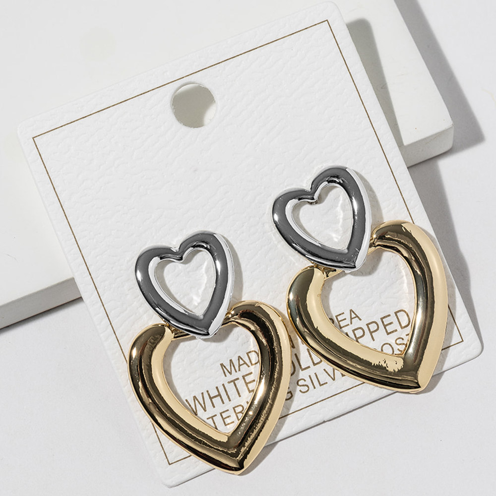 Details • Size : 1" X 1.5" • Double heart drop earrings featuring a layered open-heart silhouette that creates a modern yet romantic look. Designed to add movement and visual interest, this versatile style is perfect for everyday wear, giftable collections, and seasonal edits, pairing effortlessly with both casual and elevated outfits. • Gold Dipped • Lead and Nickel Compliant • Made In Korea • Sterling Silver Post