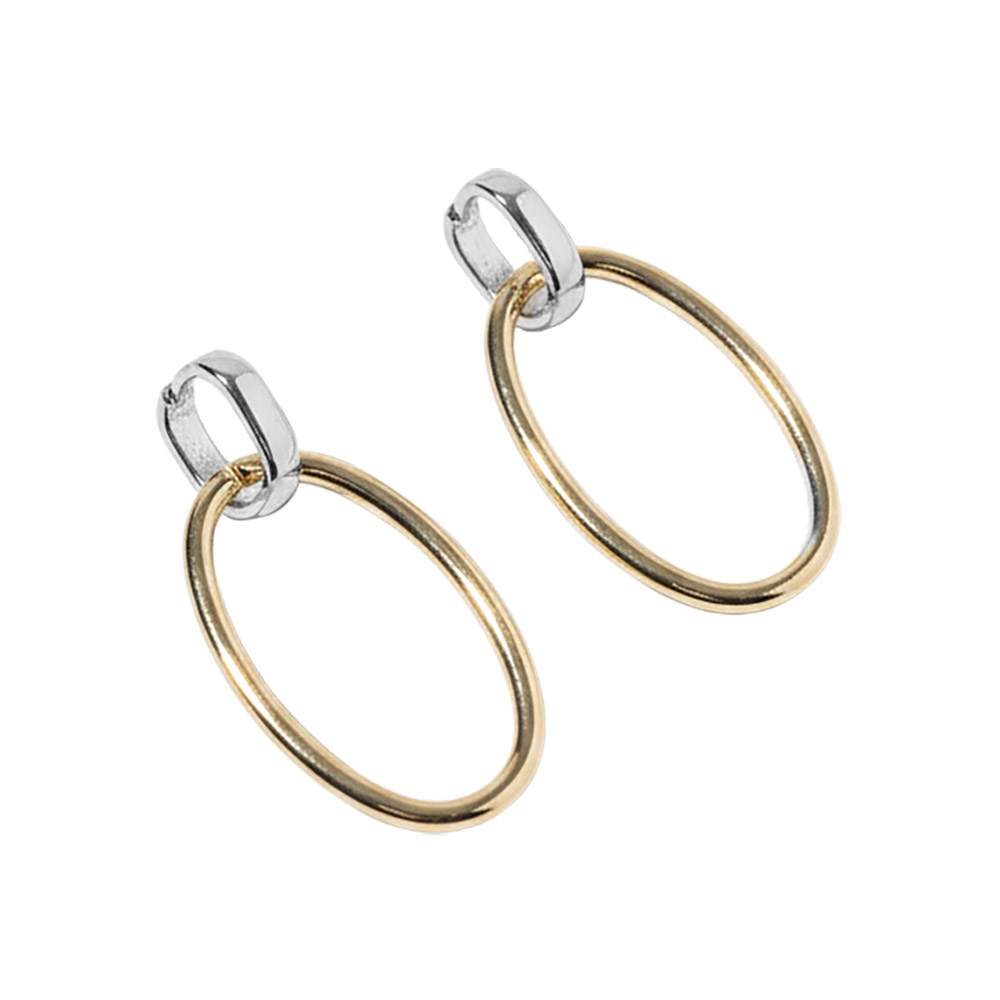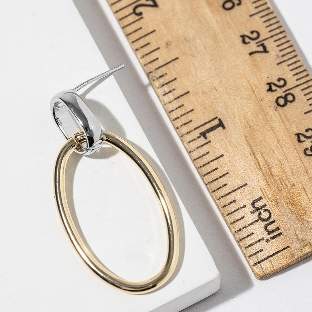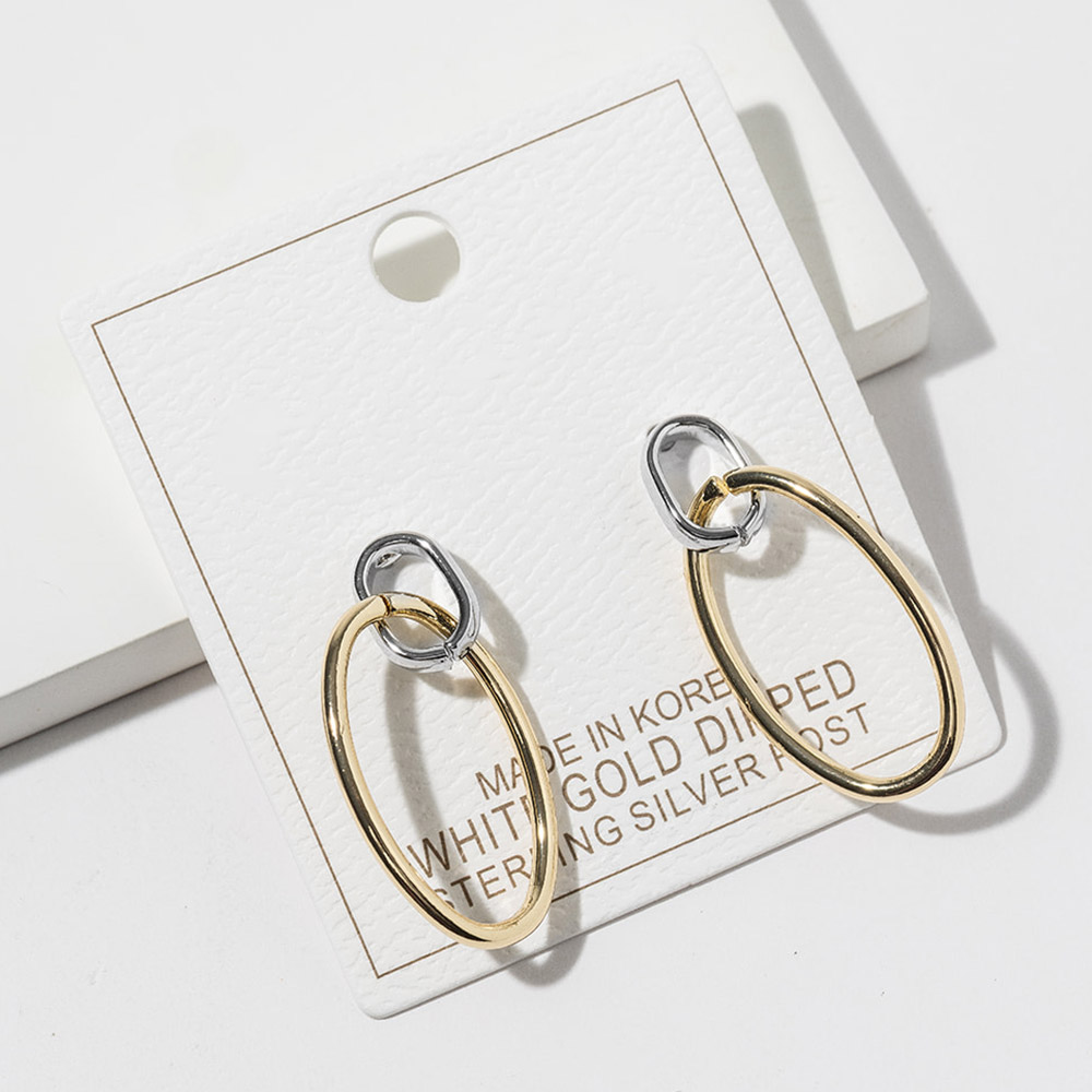 Details • Size : 0.6" X 1.3" • Sleek oval hoop earrings featuring a refined interlinked accent that adds subtle movement and modern character. Designed for everyday wear or elevated styling, this versatile silhouette pairs easily with layered looks and curated collections, making it an ideal choice for boutiques, gifting assortments, and trend-forward jewelry displays. • Gold Dipped • Lead and Nickel Compliant • Made In Korea • Sterling Silver Post