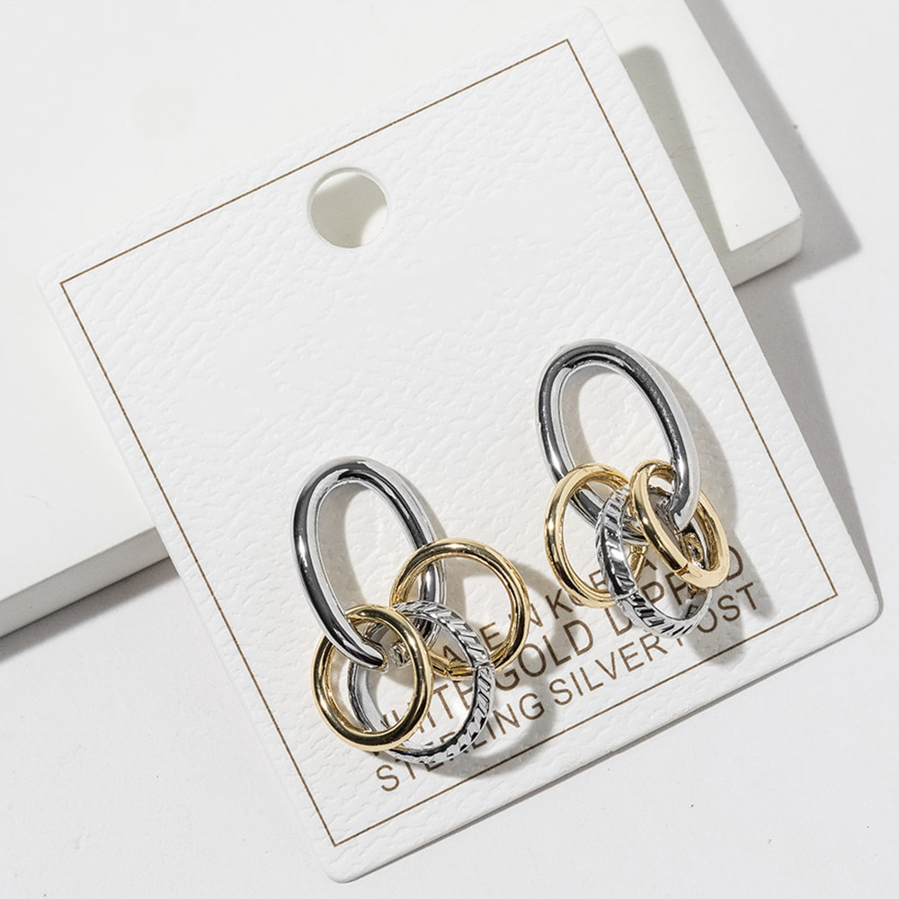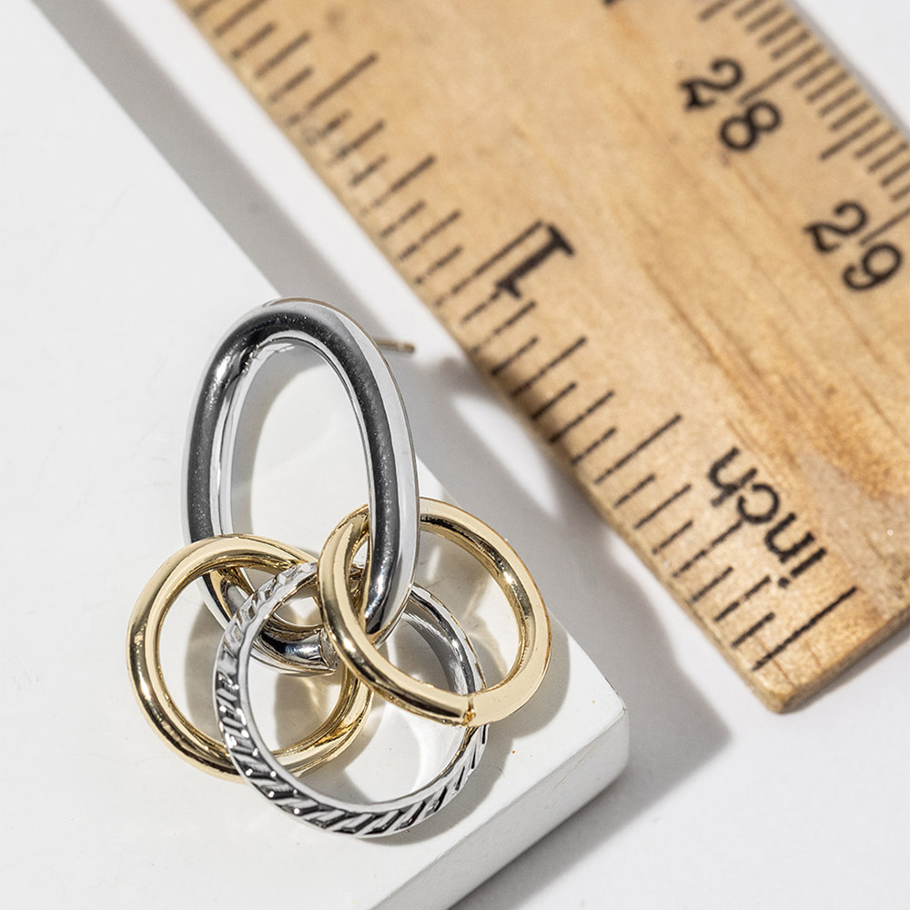 Details • Size : 0.75" X 1" • Modern drop earrings featuring layered interlinked oval rings that create depth and fluid movement. This contemporary design delivers a clean yet eye-catching look, perfect for everyday styling or elevated outfits. A versatile accessory ideal for boutique collections, gifting selections, and trend-driven jewelry assortments. • Gold Dipped • Lead and Nickel Compliant • Made In Korea • Sterling Silver Post