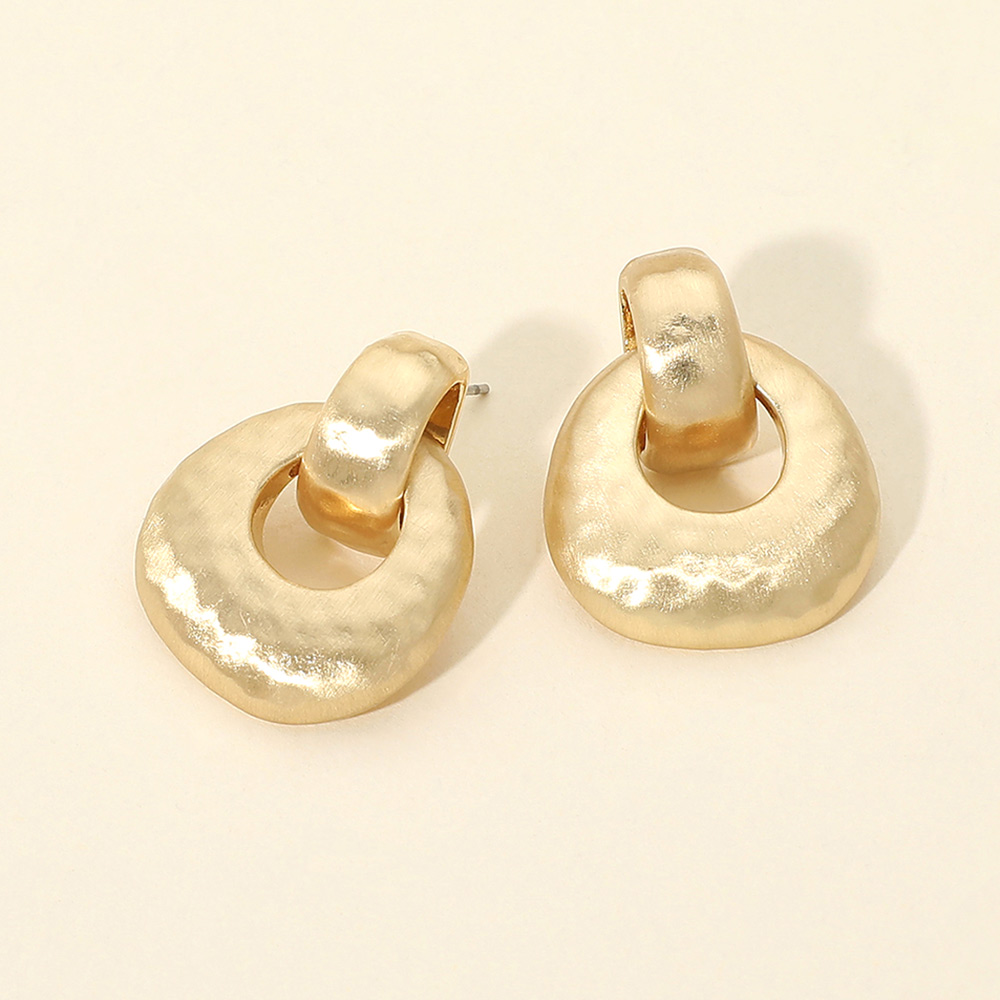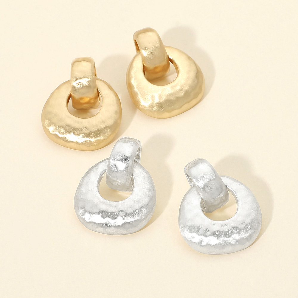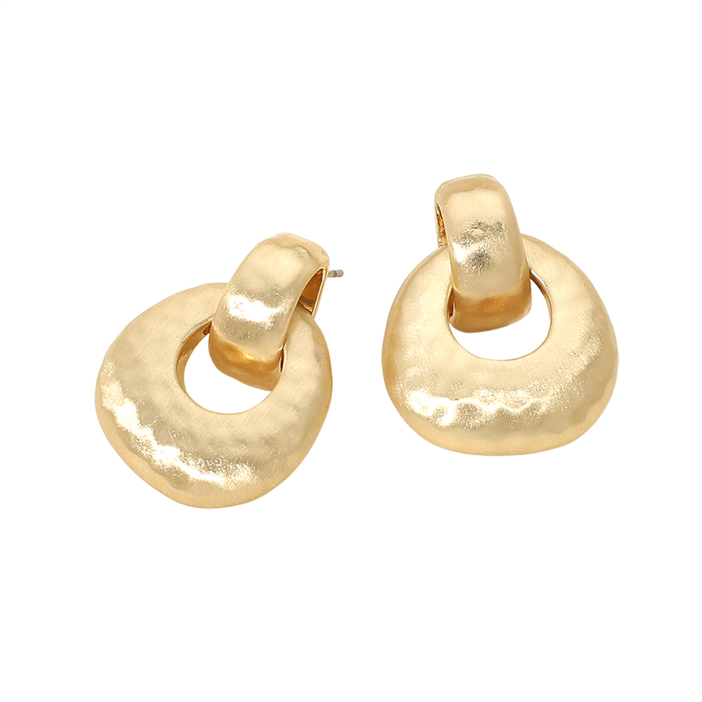 Details • Size : 0.9" X 1.1" • Post Back • Modern interlocking hoop drop door knocker earrings with a softly textured finish that creates depth and a sculptural look. Designed for comfortable wear and subtle movement, this versatile style transitions effortlessly from casual outfits to elevated looks, making it an ideal addition to everyday jewelry assortments and gift-ready boutique collections. • Lead and Nickel Compliant