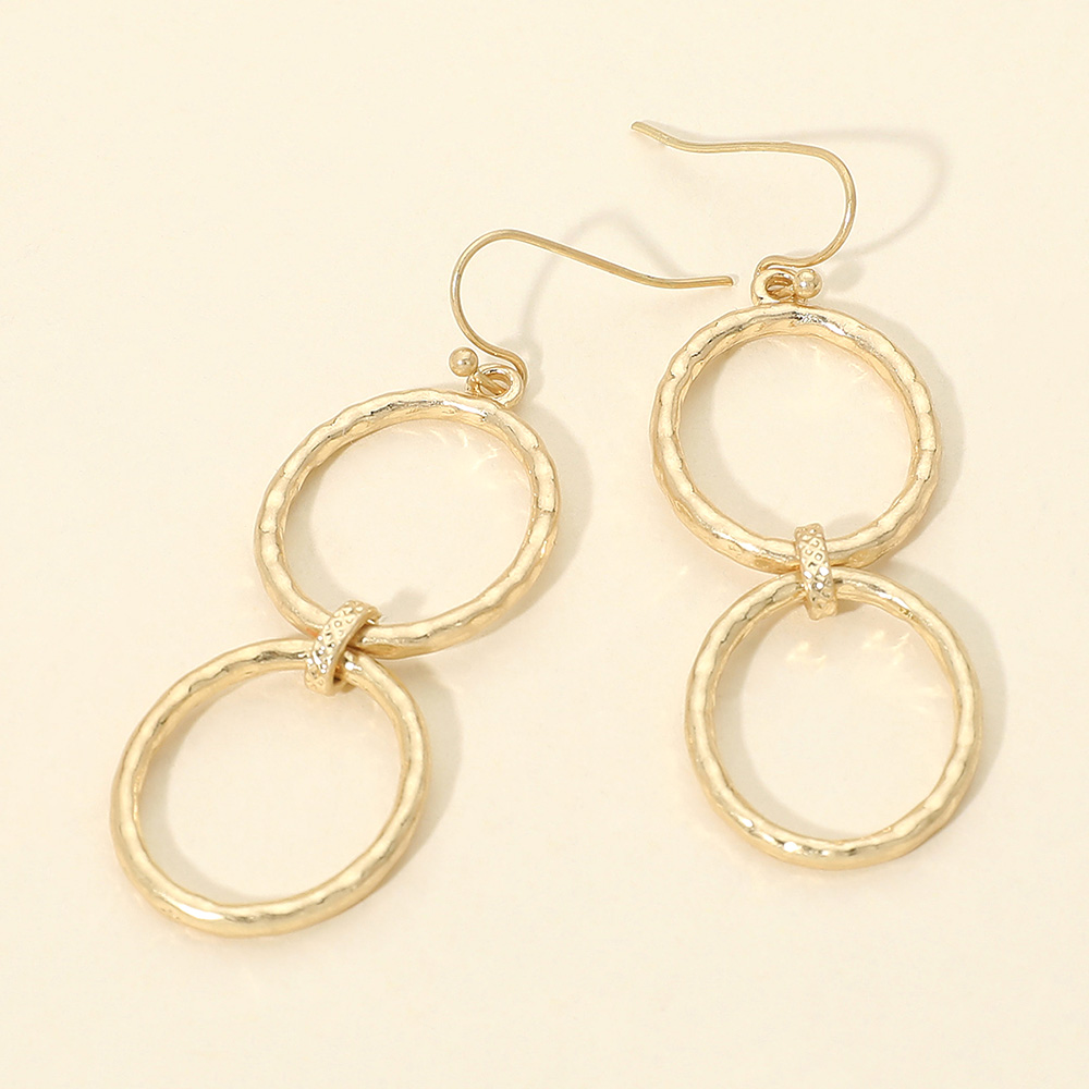 Details • Size : 0.75" X 2.25" • Fish Hook Back • Elegant double oval ring drop earrings designed with a softly textured finish for subtle movement and visual interest. The linked open-ring silhouette creates a modern yet timeless look that transitions easily from casual outfits to dressy occasions. Lightweight and easy to style, these earrings are ideal for everyday wear, gifting, and boutique jewelry collections. • Lead and Nickel Compliant