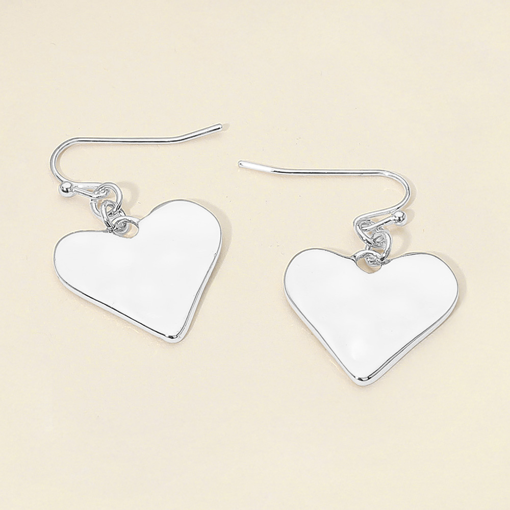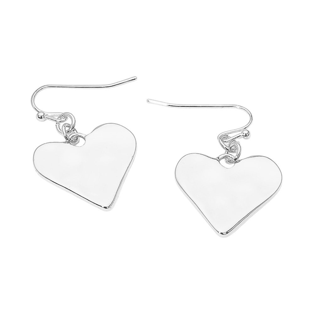 • These hammered heart dangle earrings showcase a smooth, reflective finish with a subtly textured surface for a handcrafted charm. Lightweight and romantic, they add a touch of playful elegance to any look, perfect for expressing love and style in both casual and dressy moments.