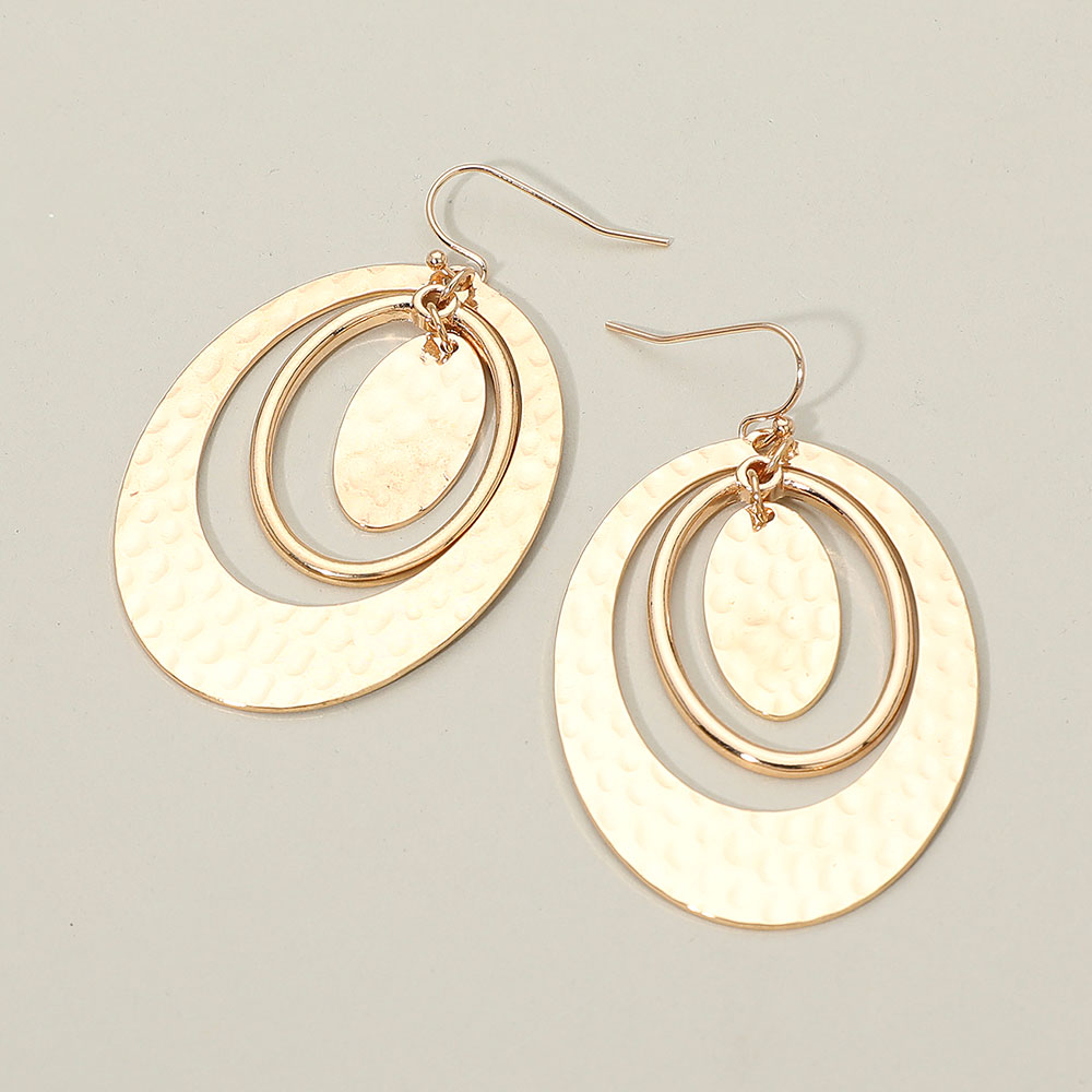 Details • Size : 1.4" X 2.25" • Fish Hook Back • Elevate your accessory game with these textured oval layered dangle earrings. Featuring interlocking open ovals with a subtle hammered finish, they blend modern sophistication with timeless elegance. Perfect for adding movement and shine to both casual and dressy looks. • Lead and Nickel Compliant