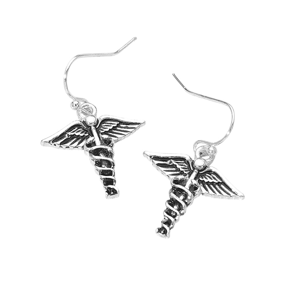 Details • Size : 0.8" X 1.25" • Fish Hook Back • These caduceus symbol drop earrings feature a detailed winged staff design with a lightweight dangling silhouette. Ideal for medical, healthcare, nurse, and doctor-themed collections, they offer meaningful style for everyday wear, gifting, events, and boutique displays with a professional yet playful touch. • Lead and Nickel Compliant