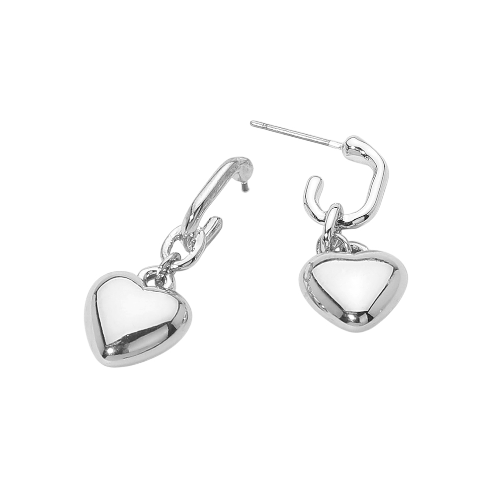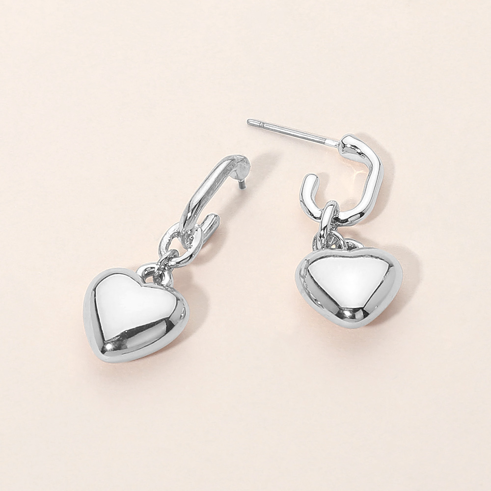 Details • Size : 0.5" X 1.25" • Post Back • These heart charm drop earrings feature a smooth heart accent suspended from a compact huggie silhouette for subtle movement and modern appeal. Designed for everyday wear or gifting, they add a romantic touch while remaining easy to style with casual looks, layered jewelry, or special occasion outfits. • Lead and Nickel Compliant