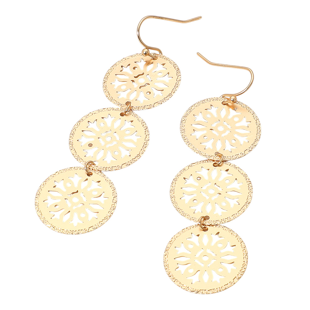 Details • Size : 0.8" X 2.7" • Fish Hook Back • Make a bold impression with these triple disc dangle earrings. Featuring an intricate snowflake cutout design, they offer a modern geometric touch perfect for elevating casual and evening outfits. • Lead and Nickel Compliant