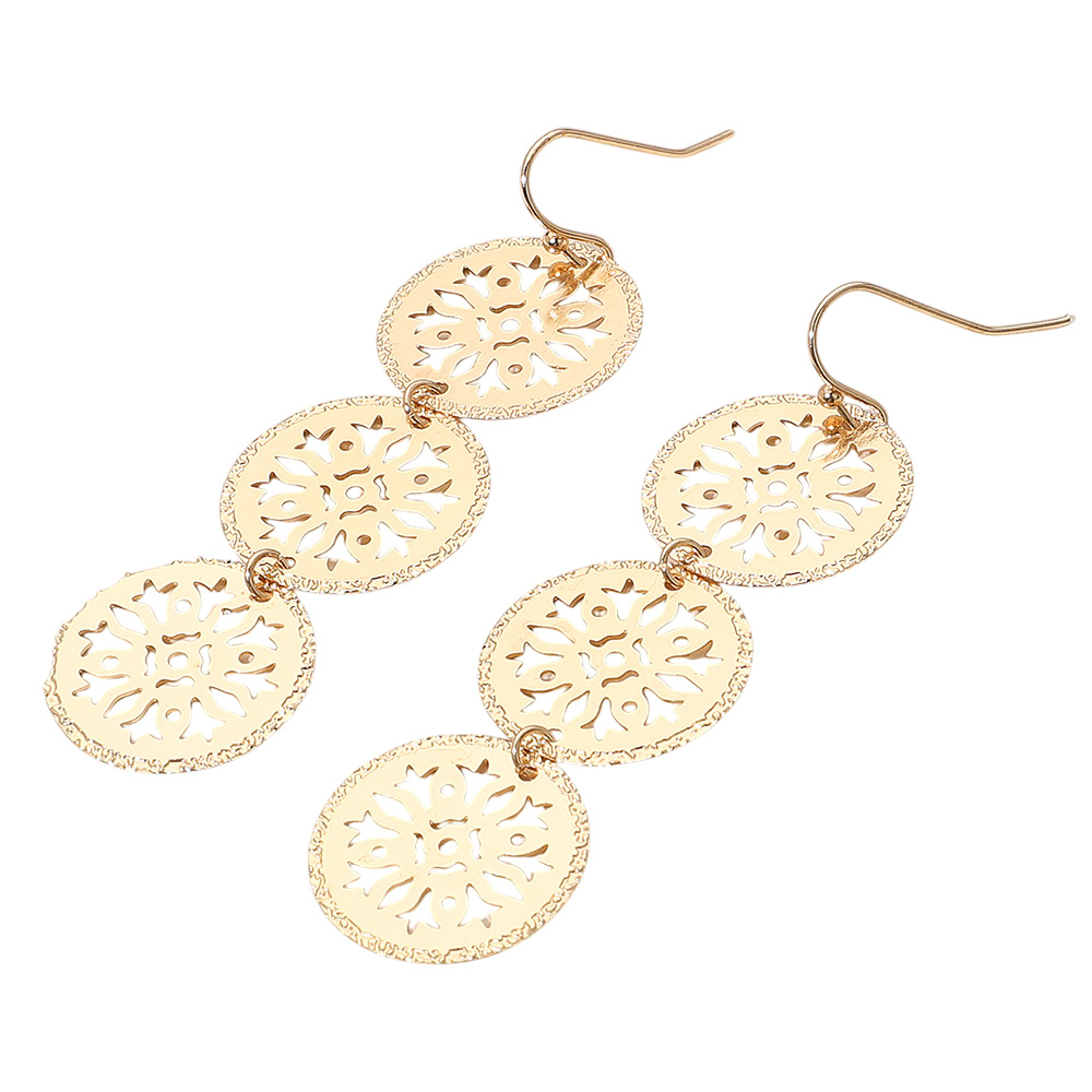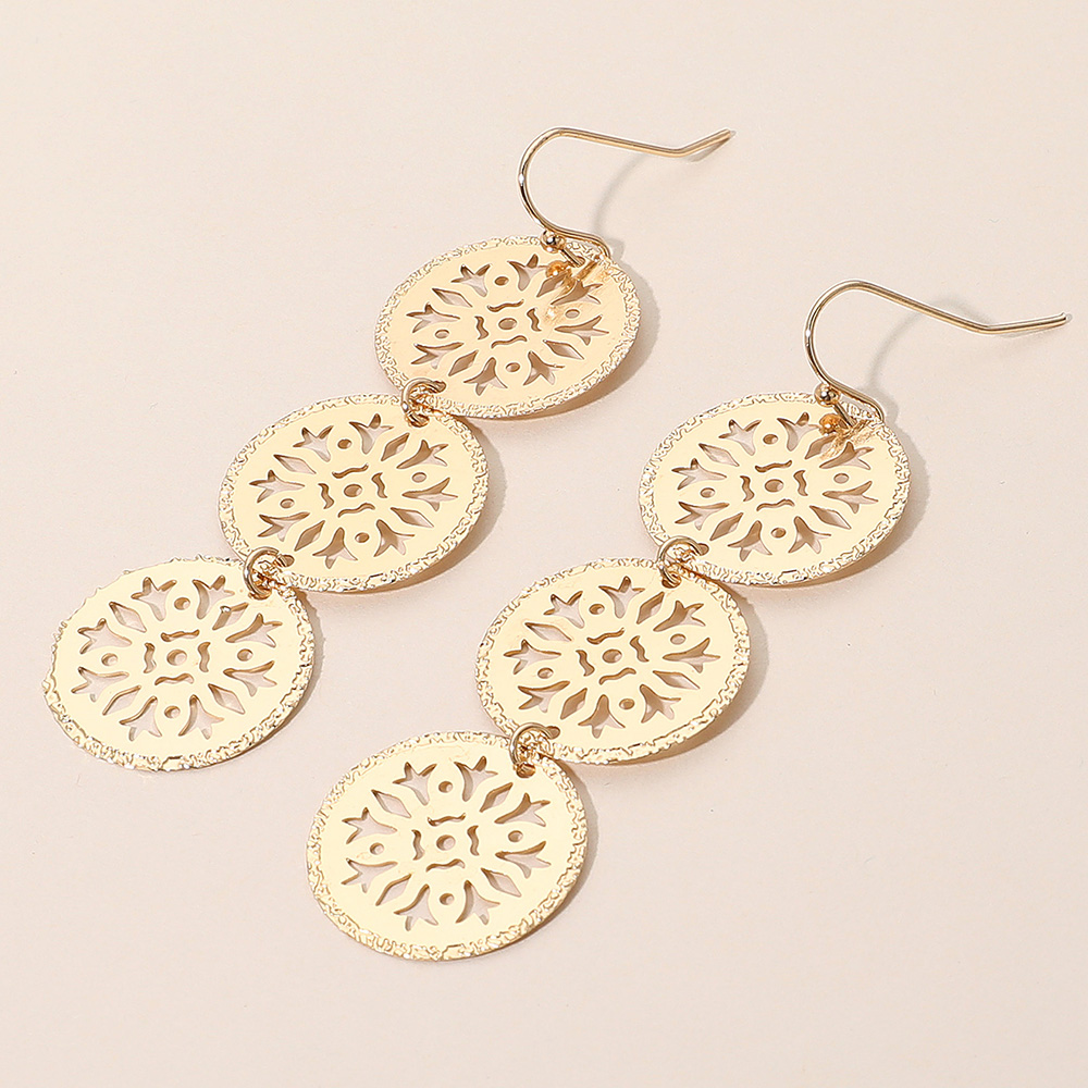 • Make a bold impression with these triple disc dangle earrings. Featuring an intricate snowflake cutout design, they offer a modern geometric touch perfect for elevating casual and evening outfits.