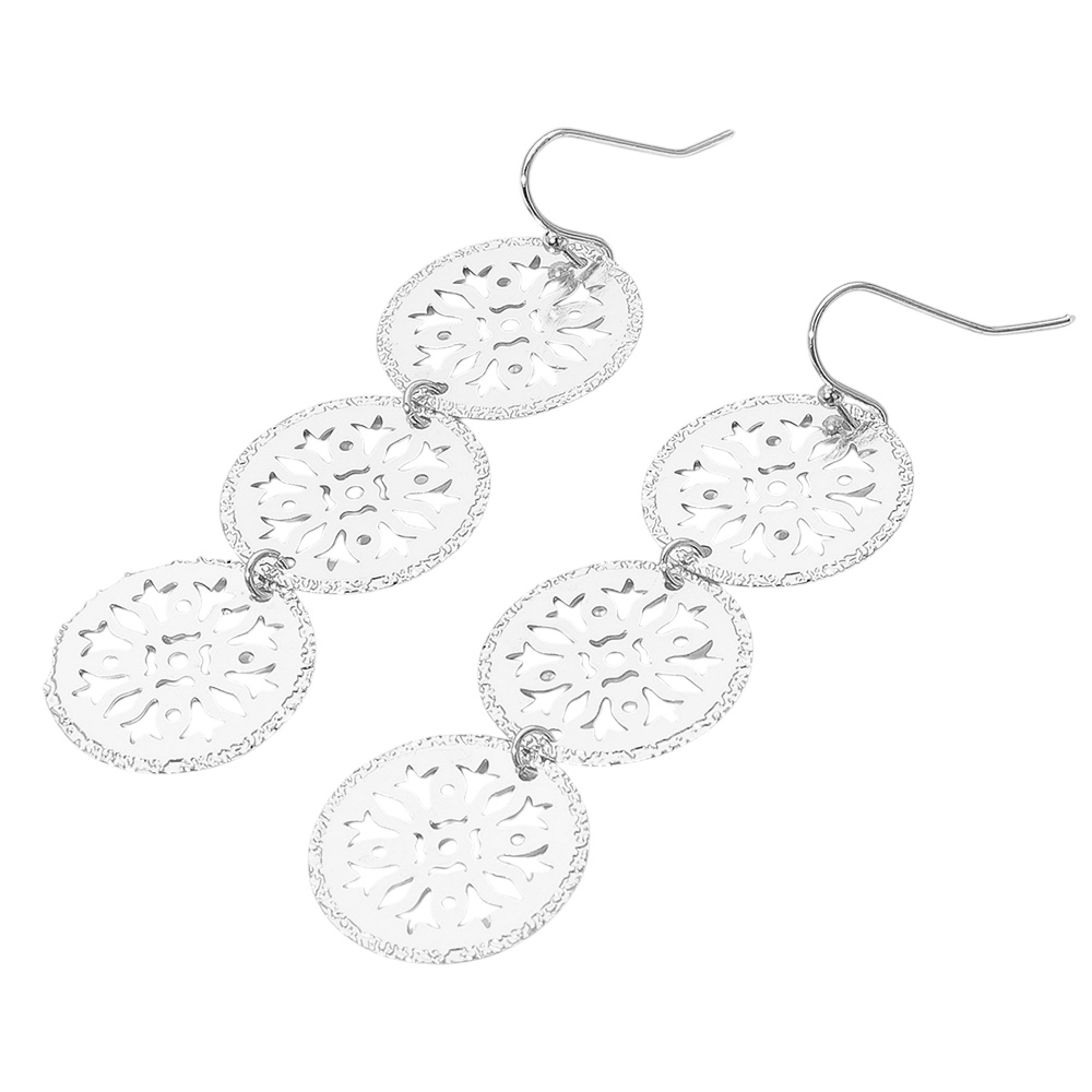 • Make a bold impression with these triple disc dangle earrings. Featuring an intricate snowflake cutout design, they offer a modern geometric touch perfect for elevating casual and evening outfits.