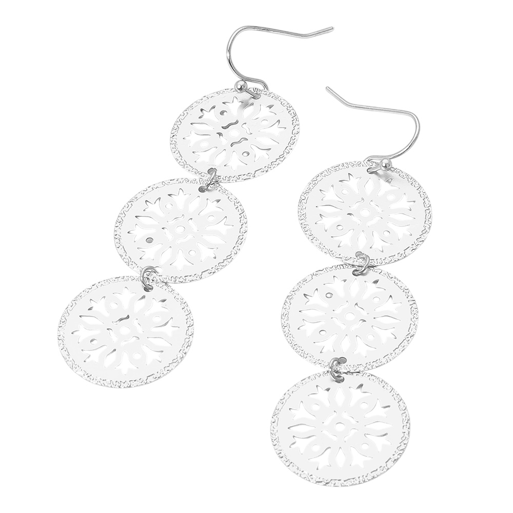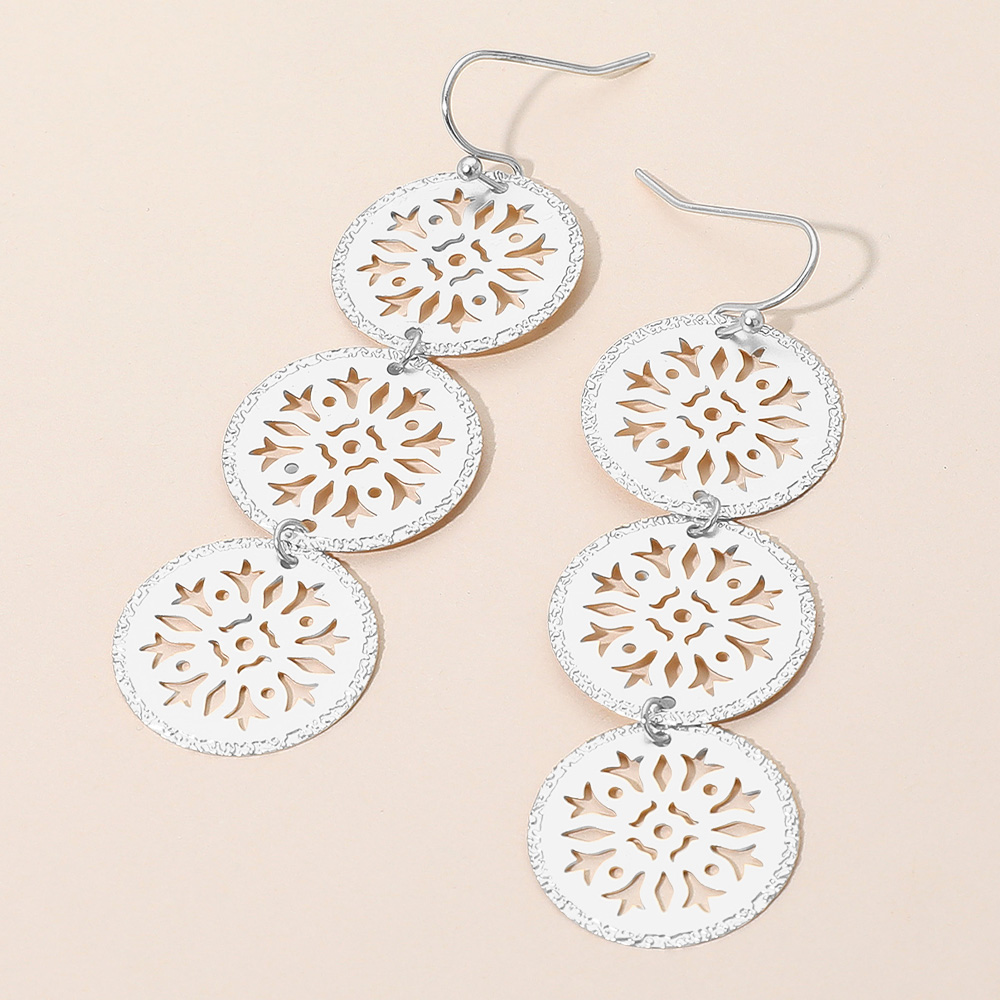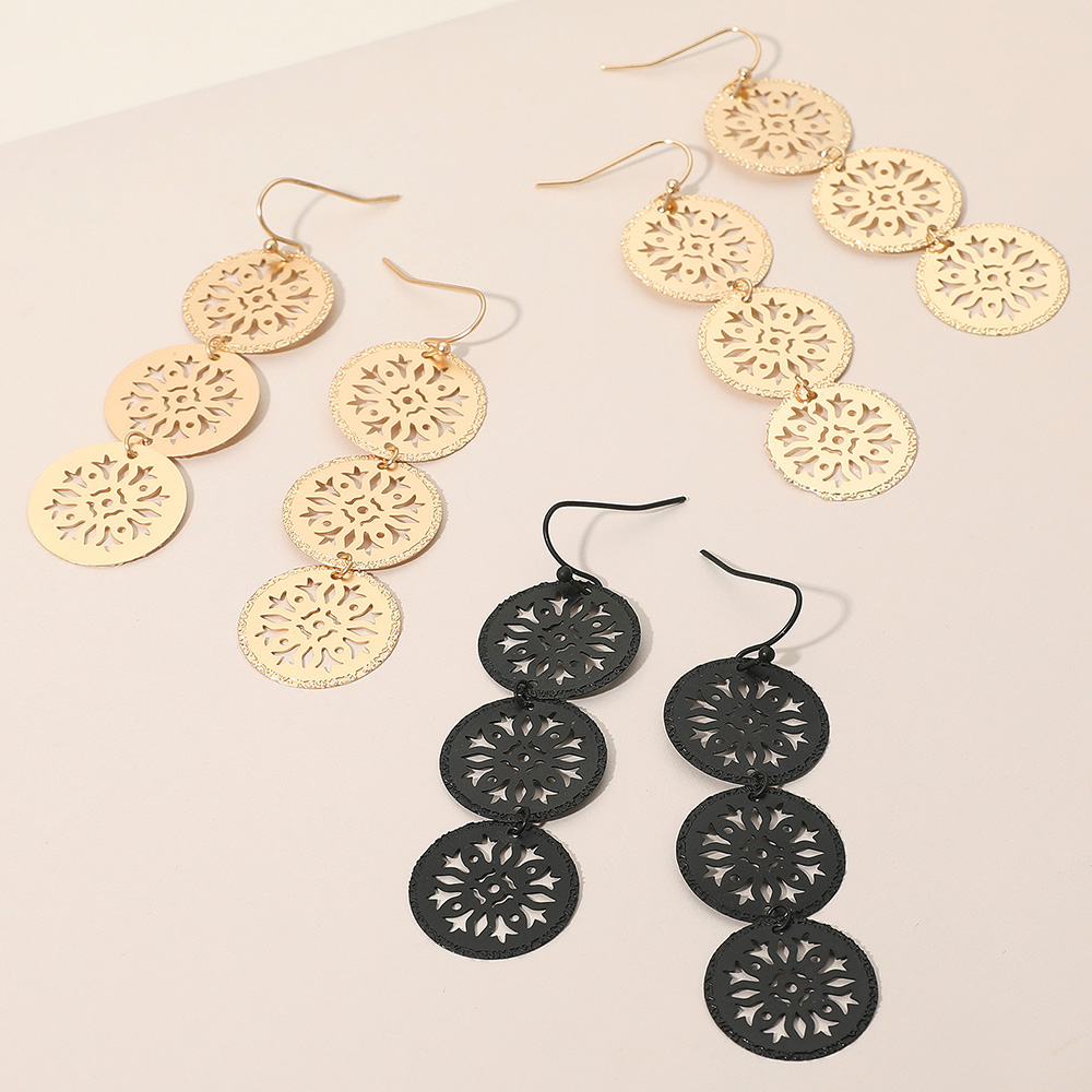 • Make a bold impression with these triple disc dangle earrings. Featuring an intricate snowflake cutout design, they offer a modern geometric touch perfect for elevating casual and evening outfits.