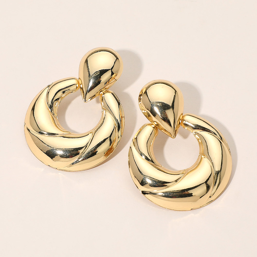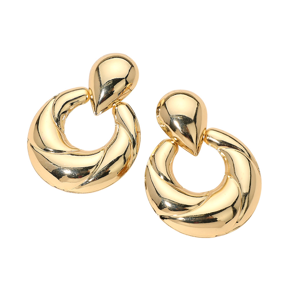Details • Size : 1.6" X 2.1" • Post Back • Bold twisted ring drop earrings featuring a sculpted swirl design paired with a smooth teardrop top for a modern statement look. These chunky yet balanced earrings add instant polish to everyday outfits and elevated styles alike, making them a versatile choice for casual wear, work looks, or evening styling. Designed for customers seeking contemporary hoop drop earrings with strong visual impact. • Lead and Nickel Compliant