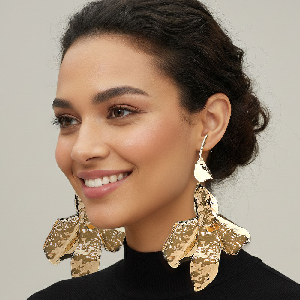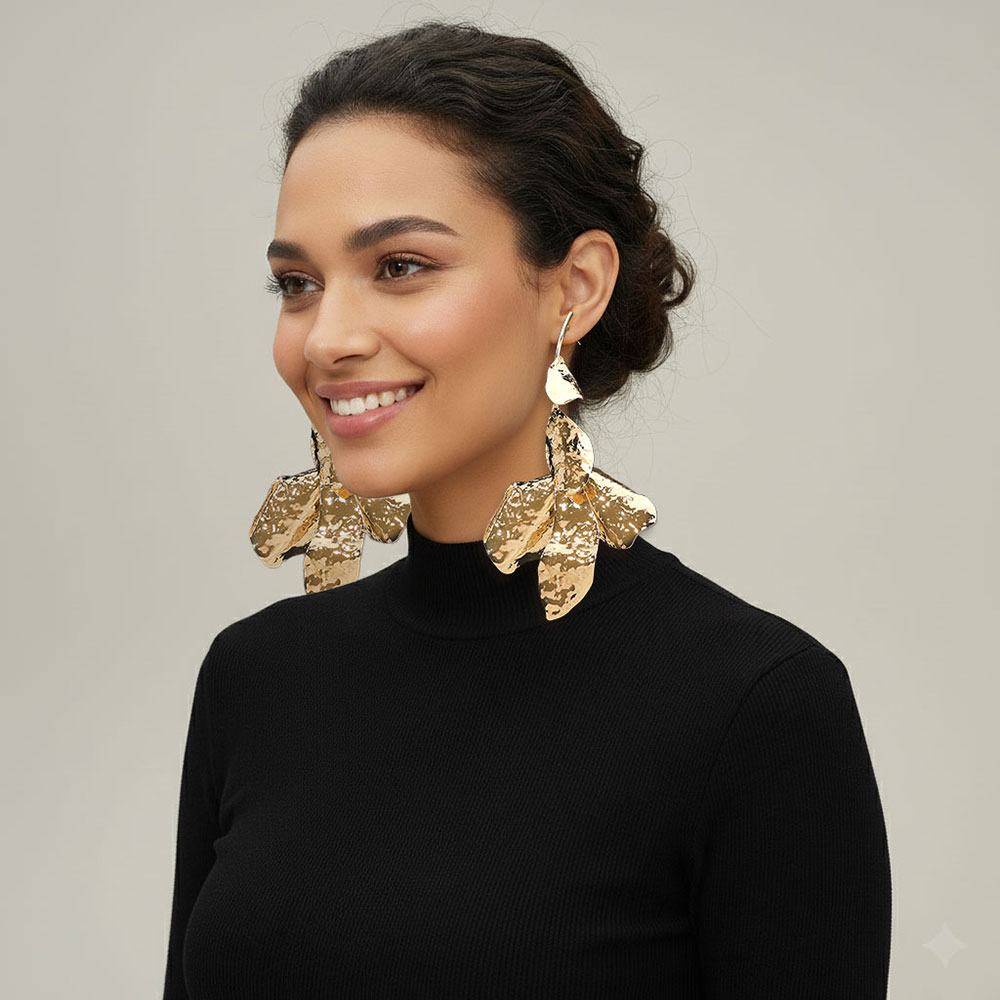 Details • Size : 3.2" X 4.6" • Post Back • Make a bold impression with these sculpted statement leaf dangle earrings. Featuring an abstract, hammered design that catches the light beautifully, they embody modern artistry and elegance. Perfect for elevating evening outfits or adding a dramatic edge to your daywear look. • Lead and Nickel Compliant