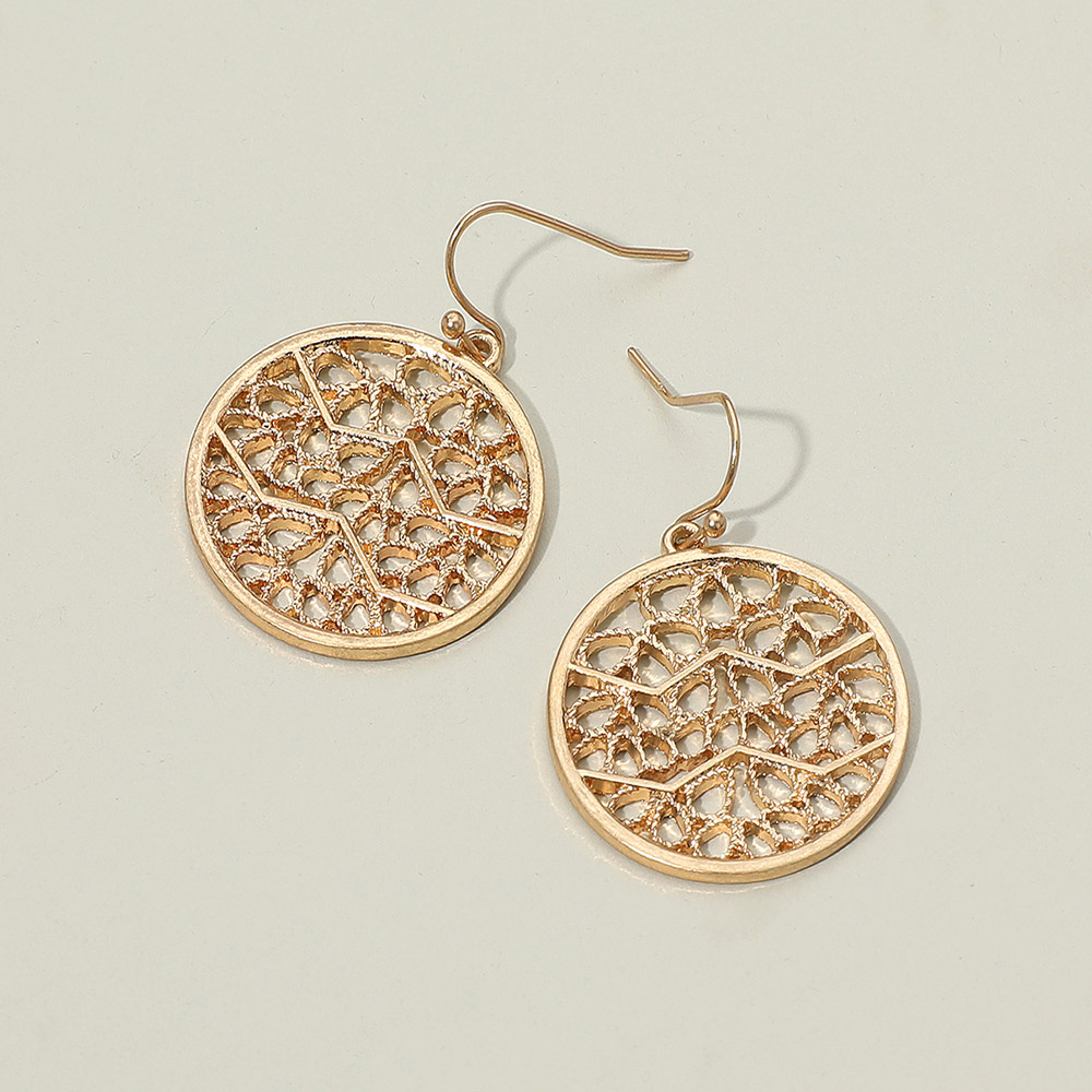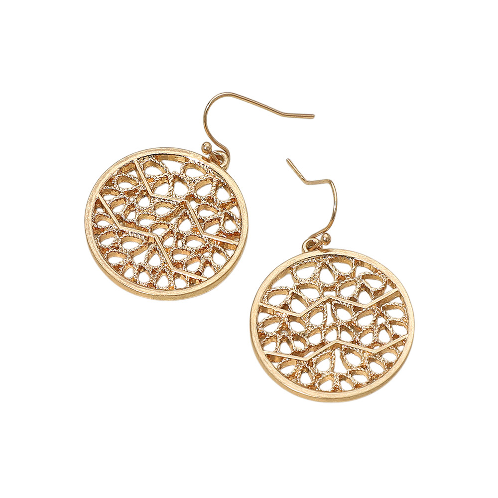 • Stylish round filigree dangle earrings with an intricate cutout pattern for a delicate yet eye-catching look. Lightweight and versatile, perfect for adding a touch of elegance to casual or dressy ensembles.