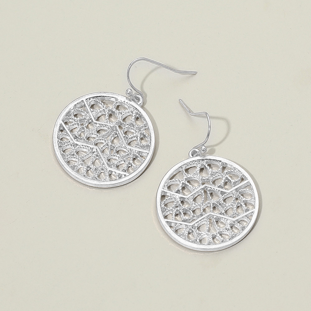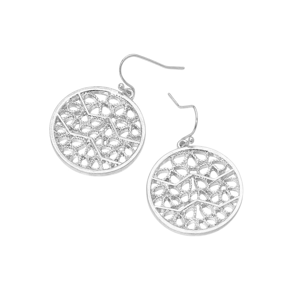 Details • Size : 1.9" X 2.6" • Fish Hook Back • Stylish round filigree dangle earrings with an intricate cutout pattern for a delicate yet eye-catching look. Lightweight and versatile, perfect for adding a touch of elegance to casual or dressy ensembles. • Lead and Nickel Compliant