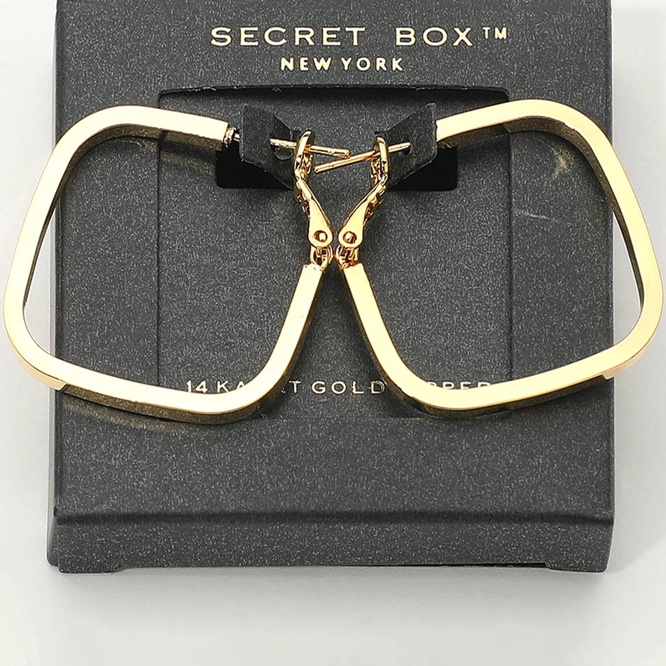 Details • Size : 1.25" X 1.25" • Omega Back • Make a bold statement with these modern geometric hoop earrings featuring a sleek square design. Lightweight yet eye-catching, they add a contemporary touch to both casual and dressy looks. Perfect for fashion-forward styling and everyday elegance. • Gold Dipped