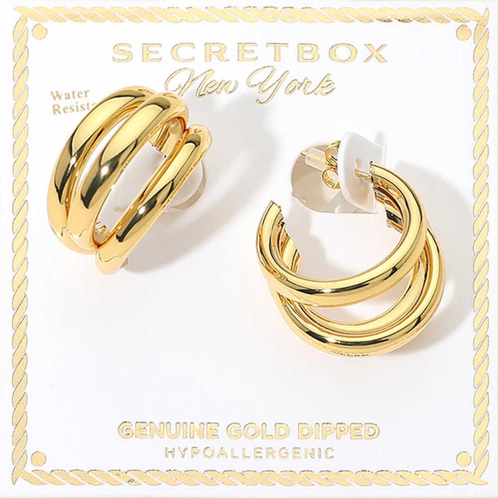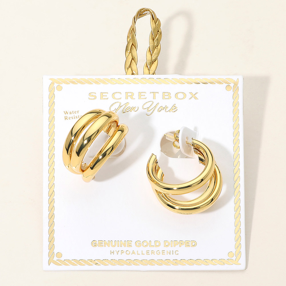 Details • Size : 1.25" X 1.2" X 0.75" • Post Back • Bold hoop earrings designed with a layered, sculpted silhouette that delivers a confident, polished look. Comfortable for all-day wear and easy to style with casual or dressy outfits. Perfect for everyday accessorizing, work looks, gifting, and trend-forward jewelry collections that favor clean, modern design. • Gold Dipped • Hypoallergenic