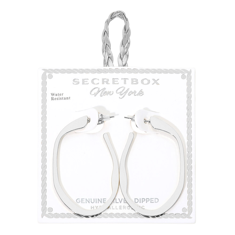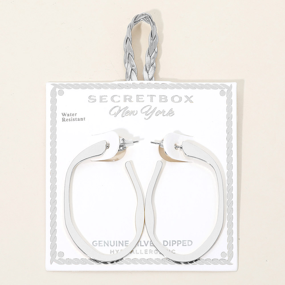 Details • Size : 1.2" X 1.8" • Post Back • Water Resistant • These minimalist oval hoop post earrings feature a sleek, modern silhouette designed for effortless everyday styling. Lightweight and comfortable with secure post backs, they offer a polished look that transitions easily from casual outfits to elevated occasions. A versatile essential for layering or wearing solo, these hoops add clean, timeless appeal to any jewelry collection while maintaining a refined, understated presence. • Sterling Silver Dipped • Hypoallergenic