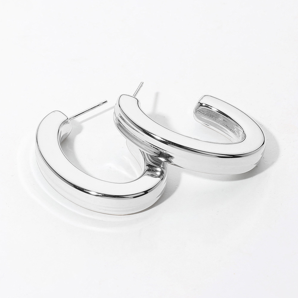 Details • Size : 1.2" X 1.4" • Post Back • Water Resistant • Make a bold style statement with these thick, curved hoop earrings in a modern open U-shape. Their unique silhouette adds a touch of elegance and edge to any outfit. • Hypoallergenic • Stainless Steel